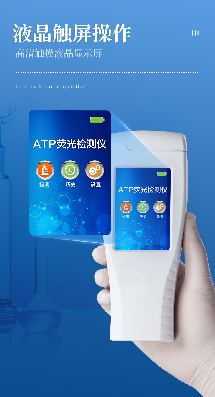 該設(shè)備為全新升級產(chǎn)品,大屏幕觸摸顯示屏,代替?zhèn)鹘y(tǒng)按鍵。操作采用生物化學(xué)反應(yīng)方法檢測ATP含量,ATP熒光檢測儀基于螢火蟲發(fā)光原理,利用“熒光素酶—熒光素體系”快速檢測三磷酸腺苷(ATP)。ATP拭子含有可以裂解細胞膜的試劑,能將細胞內(nèi)ATP釋放出來,與試劑中含有的特異性酶發(fā)生反應(yīng),產(chǎn)生光,再用熒光照度計檢測發(fā)光值,微生物的數(shù)量與發(fā)光值成正比,由于所有生物活細胞中含有恒量的ATP,所以ATP含量可以清晰地表明樣品中微生物與其他生物殘余的多少,用于判斷衛(wèi)生狀況。