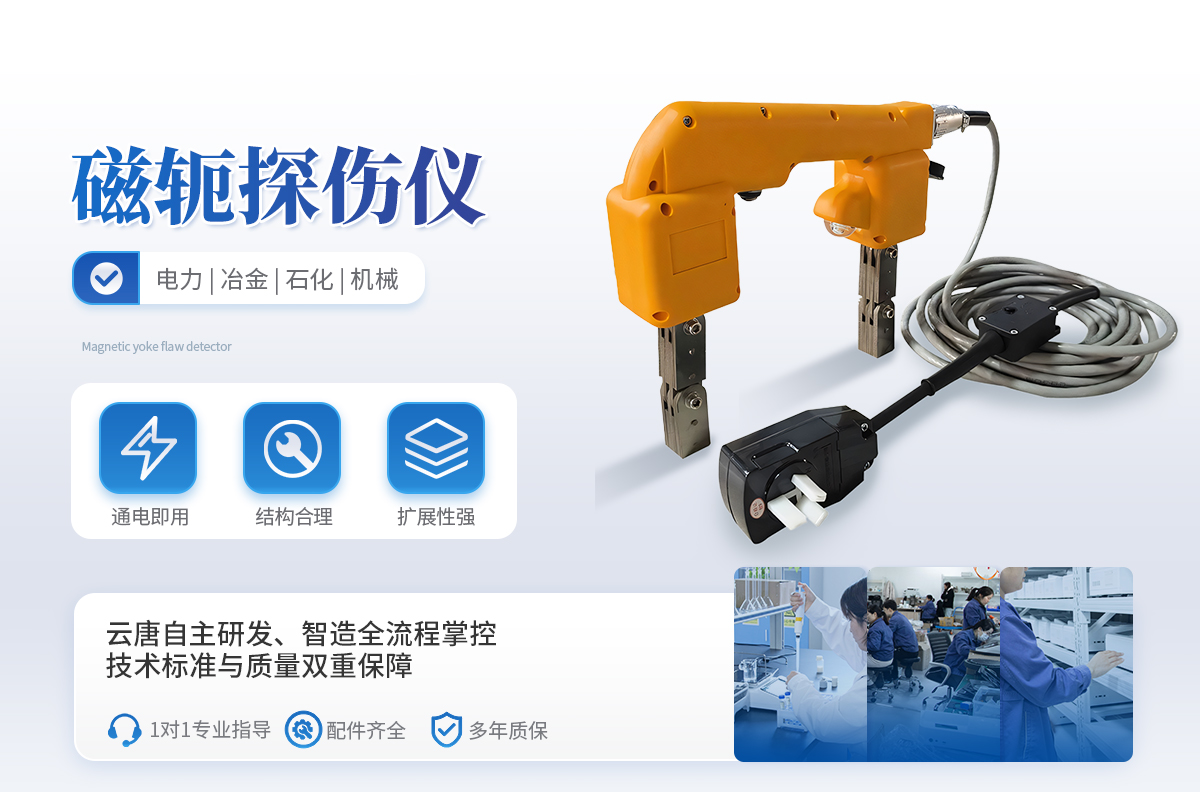 YT-CTS220C型電磁軛磁粉探傷儀,無主機設(shè)計,操作簡單方便,噪音小、重量輕、工作穩(wěn)定。配直流磁化電源(鋰電),具有交流與直流磁化功能,適用于野外無電源現(xiàn)場操作以及高壓不能進入的容器、橋梁、管道等現(xiàn)場操作,一次充電連續(xù)工作時間可達6小時以上。交流供電電源采用~220V電源直接輸入,無需其他儀器配套,操作方便、簡單、重量輕、便于攜帶,因而該儀器得到廣泛使用。