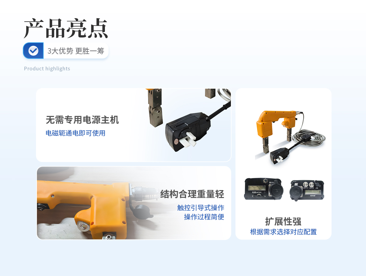 | 1、 無需專用電源主機,電磁軛通電即可使用; | 2、 體積小巧,重量輕; | 3、 開模制作,結(jié)構(gòu)合理,手感舒適; | 4、 磁軛標配白光燈,可選熒光燈(不額外加費用); | 5、 配專用儀器箱; | 6、 擴展性強,可根據(jù)需要增配對應(yīng)的專用電池包,通過專用電源來實現(xiàn)交流、直流磁化功能??蓾M足不方便拖電源線的場所使用。 |