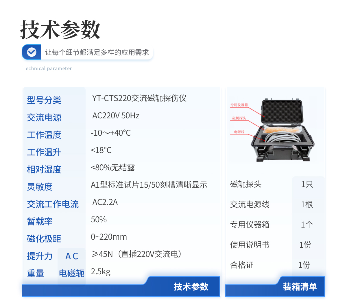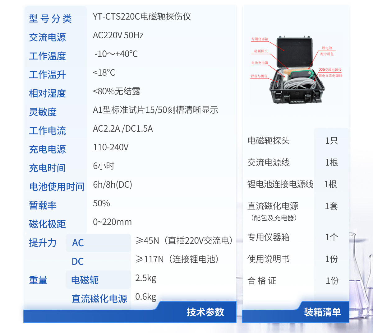 | 1.磁軛探頭1只 | 2.交流電源線1根 | 3.鋰電池連接電源線 1 根 | 4.直流磁化電源(配包及充電器) 1 套 | 5.專用儀器箱 1 個 | 6.使用說明書 1 份 | 7.合 格 證 1 份 |