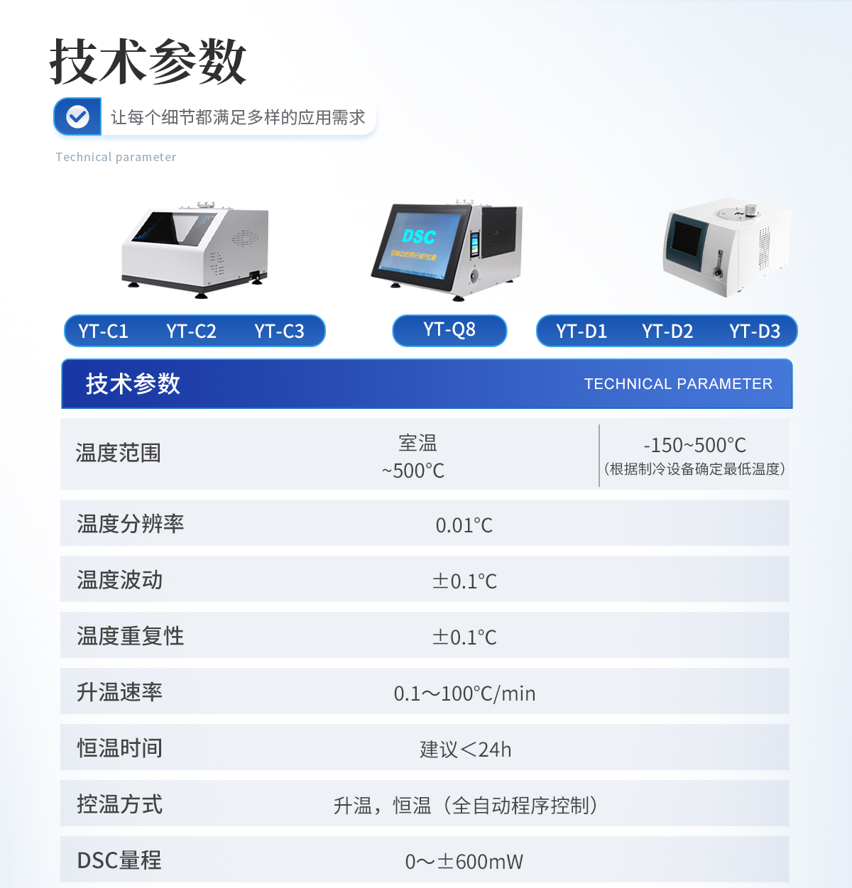1.溫度范圍: -150~500℃ (根據(jù)制冷設(shè)備確定**溫度) 2.溫度分辨率: 0.01℃ 3.溫度波動: ±0.1℃ 4.溫度重復性: ±0.1℃ 5.升溫速率: 0.1~100℃/min 6.恒溫時間:建議<24h 7.控溫方式:升溫,恒溫(全自動程序控制) 8.DSC量程: 0~±600mW 9.DSC解析度: 0.01mW 10.DSC靈敏度: 0.01mW 11.工作電源: AC220V/50Hz或定制 12.可選冷卻設(shè)備: - 壓縮空氣冷卻(-AR):RT ... 500℃ - 機械制冷(-MR): -40 ... 500℃ - 液氮制冷(-LN):-150 ... 500℃ (可以單獨或同時連接多種冷卻裝置) 13. 氣氛控制氣體:氮氣、氧氣(儀器自動切換) 14.氣體流量:0-300mL/min 15.氣體壓力:0.2MPa 16.顯示方式: 24bit色,8寸 LCD觸摸屏顯示 17.數(shù)據(jù)接口:標準USB接口 18.參數(shù)標準: 配有標準物質(zhì)(銦,錫,鋅),用戶可自行校正溫度