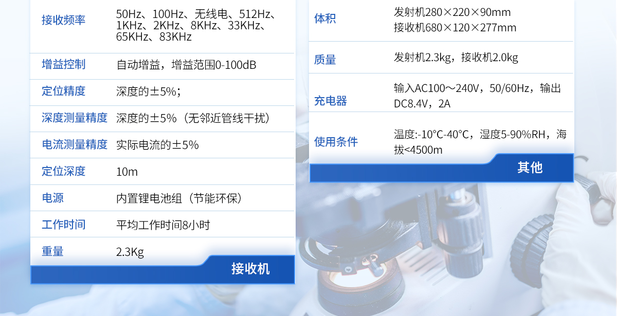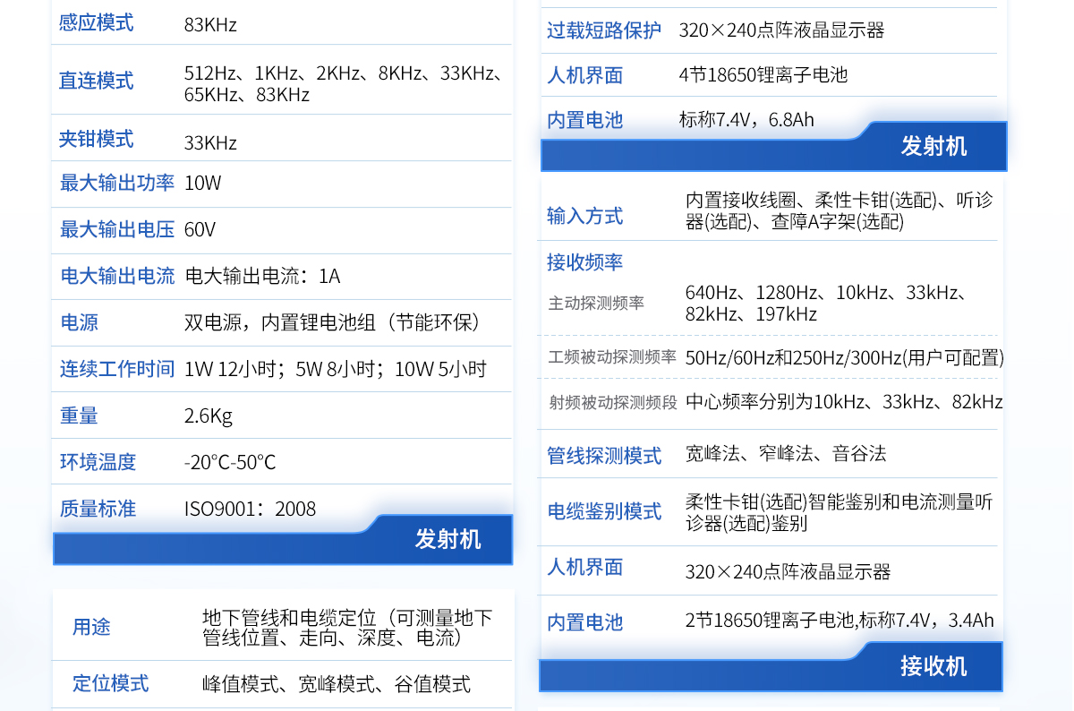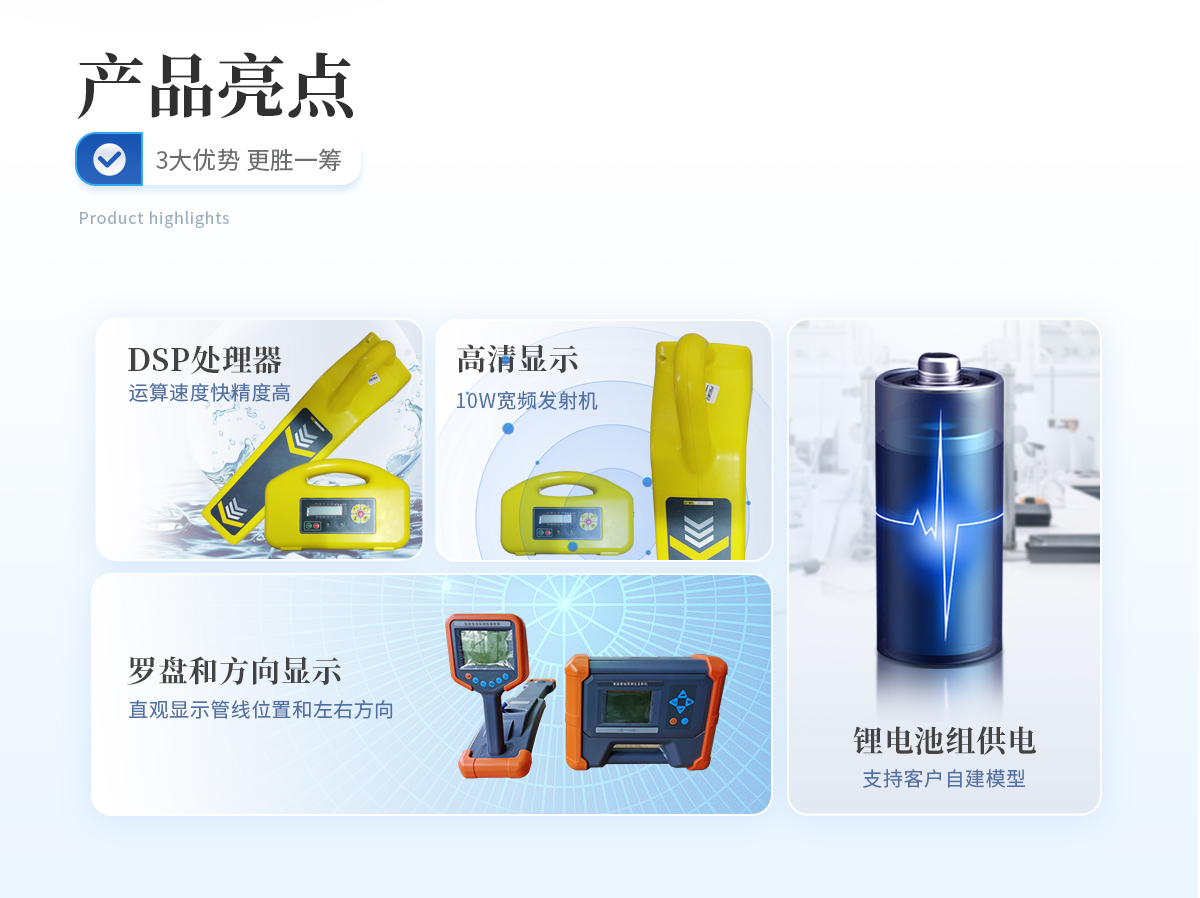 | 1、采用DSP處理器,運(yùn)算速度快,精度更高; | 2、帶有導(dǎo)向功能指標(biāo)管線走向,定位更快; | 3、采用10W寬頻發(fā)射機(jī),適應(yīng)各種環(huán)境的探測(cè); | 4、接收機(jī)和發(fā)射機(jī)都采用鋰電池組供電,節(jié)能環(huán)保,每年可節(jié)省3000-5000元的電池費(fèi)用。 |