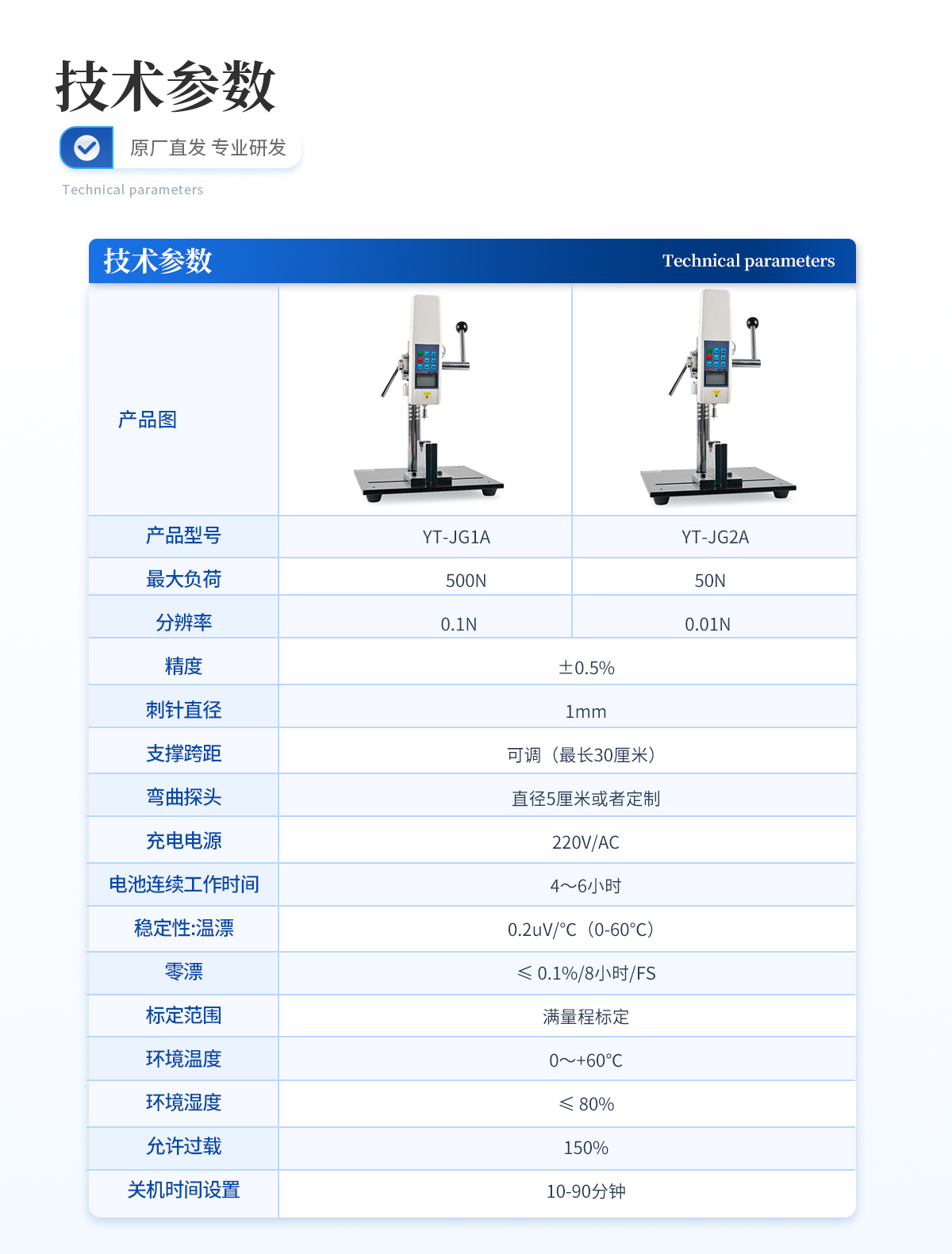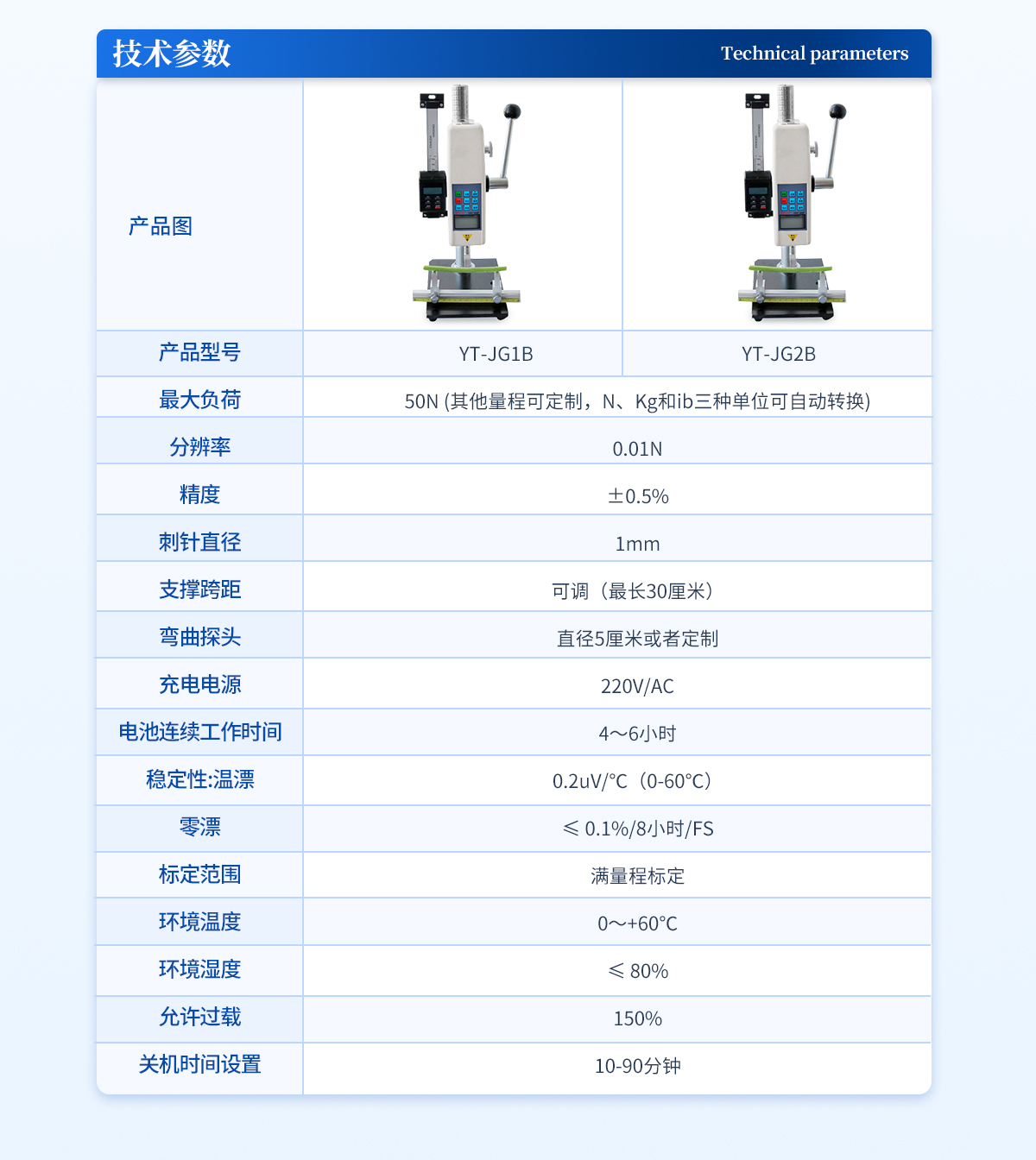 | **負(fù)荷:50N (其他量程可定制,N、Kg和ib三種單位可自動(dòng)轉(zhuǎn)換) | 分辨率:0.01N | 精度:±0.5%; | 刺針直徑:1mm | 支撐跨距:可調(diào)(*長(zhǎng)30厘米) | 彎曲探頭:直徑5厘米或者定制 | 充電電源:220V/AC; | 電池連續(xù)工作時(shí)間:4~6小時(shí); | 穩(wěn)定性:溫漂:0.2uV/℃(0-60℃); | 零漂:≤ 0.1%/8小時(shí)/FS; | 標(biāo)定范圍:滿(mǎn)量程標(biāo)定; | 環(huán)境溫度:0~+60℃; | 環(huán)境濕度:≤ 80%; | 允許過(guò)載:150%; | 關(guān)機(jī)時(shí)間設(shè)置:10-90分鐘。 |