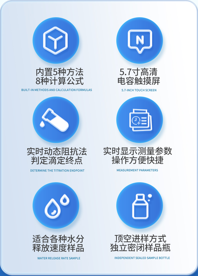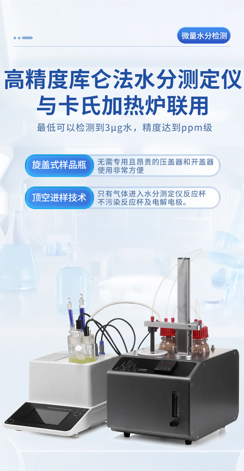 | 1. 采用高精度庫(kù)侖法水分測(cè)定儀與卡氏加熱爐聯(lián)用,**可以檢測(cè)到3μg水,精度達(dá)到ppm級(jí); | 2. 空芯氣針進(jìn)樣,和帶加熱功能的氣體輸送管路,零死體積水汽不凝結(jié),操作更簡(jiǎn)單,同時(shí)也很大的提高了儀器的準(zhǔn)確性和重復(fù)性; | 3. 5.7寸高清電容觸摸屏,實(shí)時(shí)顯示測(cè)量參數(shù),簡(jiǎn)潔明了的功能菜單,全面的參數(shù)顯示,操作方便快捷 ; | 4. 內(nèi)置5種方法可供選擇,8種計(jì)算公式方便各種樣品檢測(cè),自定義樣品單位%、ppm、mg/kg等結(jié)果單位更加人性化; | 5. 系統(tǒng)實(shí)時(shí)檢測(cè)環(huán)境中的水分,精準(zhǔn)扣除漂移,采用實(shí)時(shí)動(dòng)態(tài)阻抗法判定滴定終點(diǎn),測(cè)量結(jié)果更精準(zhǔn); | 6. **溫度300℃可以滿足大部分樣品檢測(cè),氣流0-100ml可調(diào),適合各種水分釋放速度的樣品; | 7. 操作方便,用戶只需要設(shè)置合適的溫度,合適的流量,把樣品放入事先準(zhǔn)備好的樣品瓶,放入加熱器,然后把傳輸針扎入樣品瓶的硅膠墊,在儀器上點(diǎn)開(kāi)始測(cè)量即可; | 8. 無(wú)需等待上一次樣品瓶冷卻之后才能進(jìn)行下一次樣品測(cè)量,更換樣品瓶過(guò)程中樣品瓶始終保持密封狀態(tài),測(cè)量效率更高更準(zhǔn)確,尤其是吸濕性強(qiáng)的樣品無(wú)需擔(dān)心空氣中水分的干擾; | 9. 采用頂空進(jìn)樣的方式,保證每個(gè)測(cè)定采用“新”的樣品瓶,樣品測(cè)定無(wú)交叉感染。樣品瓶體積小,確保較小的死體積和背景水分值。獨(dú)立密閉樣品瓶,測(cè)定時(shí)無(wú)需樣品轉(zhuǎn)移,結(jié)果更準(zhǔn)確; | 10. 旋蓋式樣品瓶,無(wú)需專用且昂貴的壓蓋器和開(kāi)蓋器,使用非常方便; | 11. 頂空進(jìn)樣技術(shù),只有氣體進(jìn)入水分測(cè)定儀反應(yīng)杯,不污染反應(yīng)杯及電解電極。 |