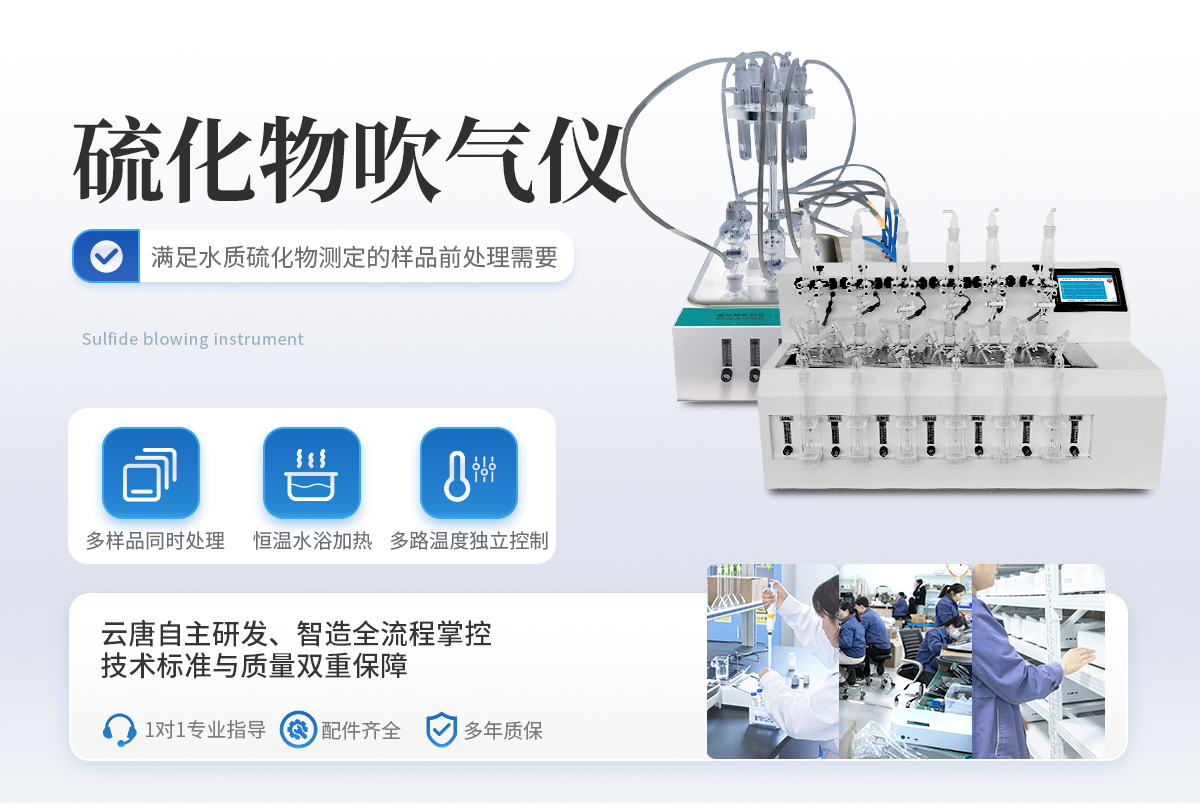 水樣中的硫化物經(jīng)酸化,生成的硫化氫隨載氣(氮氣)進入吸收瓶/吸收顯色管中被吸收溶液(乙酸鋅-乙酸鈉溶液或2%氫氧化鈉溶液)吸收,選擇相應的分析方法對吸收瓶/吸收顯色管中吸收的硫離子進行分析測定。水質硫化物酸化吹氣儀根據(jù)2022年新國標水質硫化物的測定-亞甲基藍分光光度法(典量法)標準開發(fā)生產(chǎn)的。水質硫化物測定的樣品前處理需要。