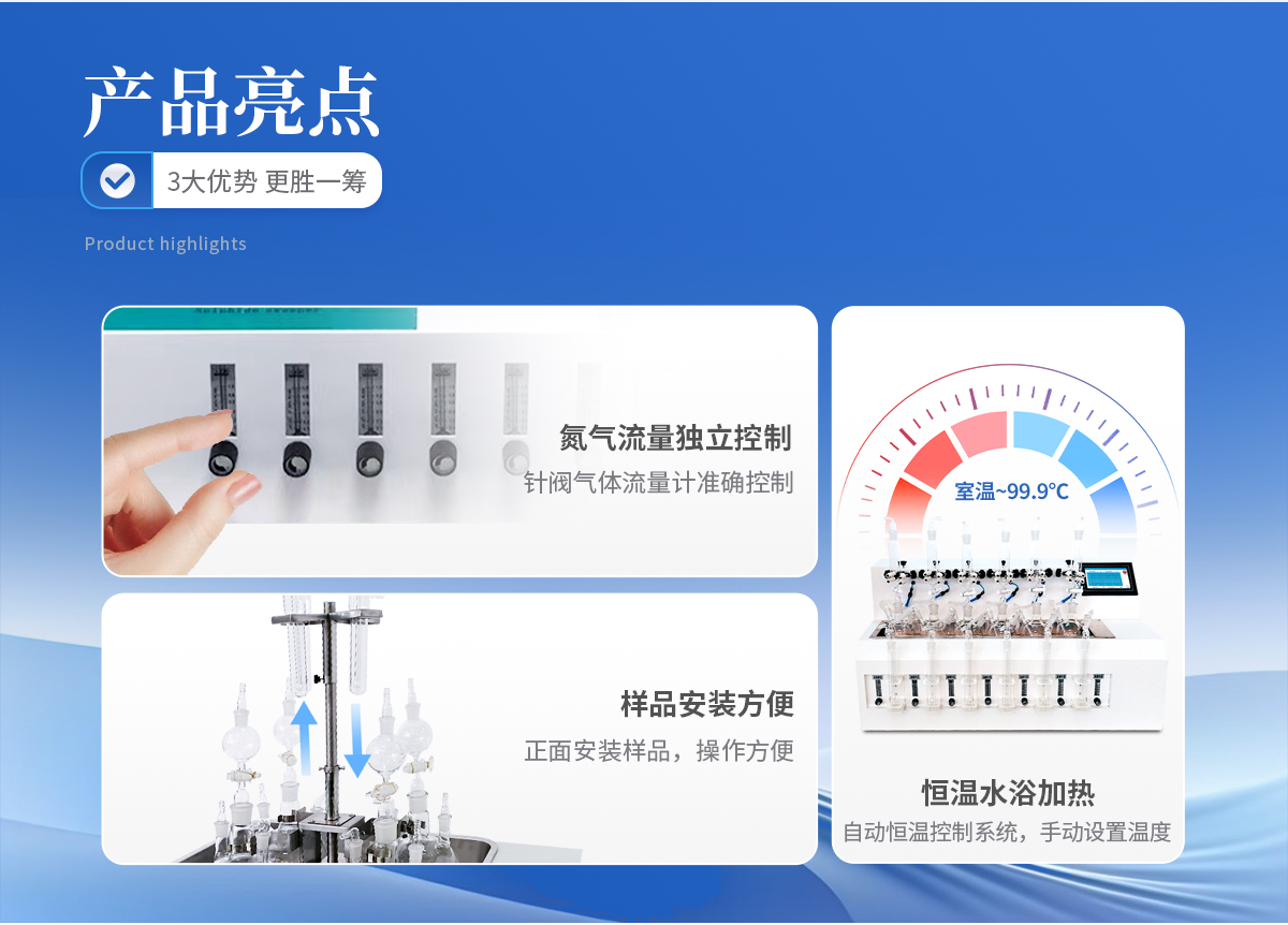 1.大容量反應瓶,可同時處理多個樣品。 2.恒溫水浴加熱,具有快速自動恒溫控制系統(tǒng),加熱溫度可以手動設定。 3.每個樣品的氮氣流量獨立控制調節(jié)或關閉,針閥氣體流量計準確控制和顯示氣體總消耗量。 4.由升降位置固定旋鈕調節(jié)樣品架及配氣系統(tǒng),旋轉樣品架的升降,正面安裝樣品,操作方便。 5.鹽酸口、氣體進氣口、出口三口一體且相互區(qū)分開,不干擾操作。