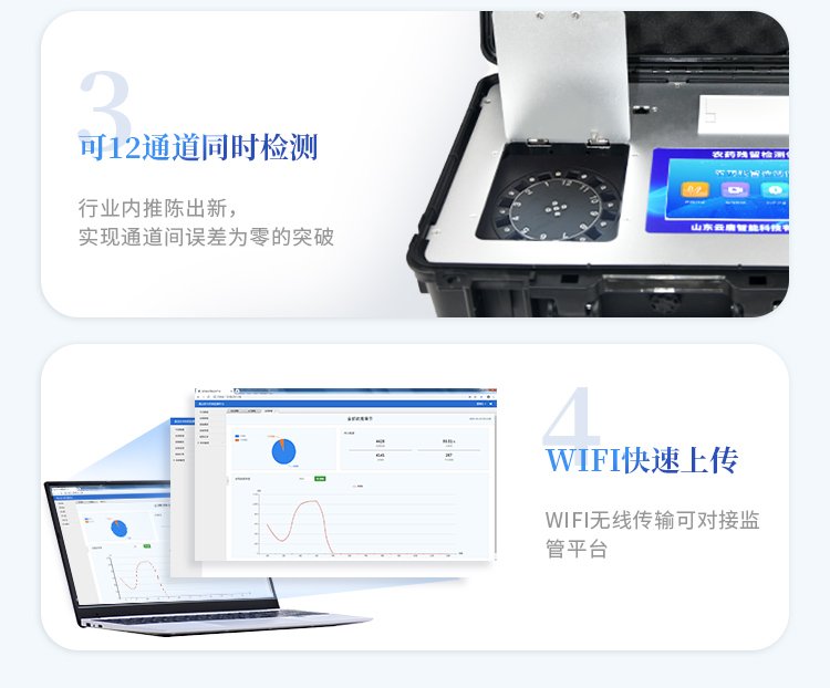 | 安卓智能操作系統(tǒng),采用更加**和人性化操作,儀器具有無線聯(lián)網(wǎng)上傳功能,快速上傳數(shù)據(jù),進(jìn)行數(shù)據(jù)統(tǒng)計(jì)和分析。 | 智能化程度高,儀器具有自檢功能:具有開機(jī)自檢和調(diào)零功能,具有自動(dòng)檢測重復(fù)性功能;同時(shí),檢測完成可自動(dòng)打印檢測報(bào)告和二維碼。手機(jī)掃碼可顯示出詳細(xì)檢測信息。 | 儀器帶有監(jiān)管平臺,數(shù)據(jù)可局域網(wǎng)和互聯(lián)網(wǎng)數(shù)據(jù)上傳,檢測結(jié)果直接傳至食品安全監(jiān)管平臺。進(jìn)行區(qū)域食品安全監(jiān)管及大數(shù)據(jù)分析處理與數(shù)據(jù)統(tǒng)計(jì),檢測區(qū)域食品安全長短期動(dòng)態(tài),達(dá)到食品安全問題預(yù)估、預(yù)警 。 | 樣品處理簡單省力,整體操作快速、安全、便捷。 | 儀器具有自身保護(hù)功能,可設(shè)置用戶名及密碼,防止非工作人員操作等。 | 內(nèi)置強(qiáng)大的數(shù)據(jù)庫,可在儀器上直接選擇樣品名稱、檢測指標(biāo)、送檢單位等信息,也可在儀器上直接編輯錄入樣品名稱、檢測指標(biāo)、送檢單位等信息并保存進(jìn)樣品數(shù)據(jù)庫,方便后期操作調(diào)取使用。 | 儀器具有重新校準(zhǔn)、鎖定、恢復(fù)出廠設(shè)置功能。 |