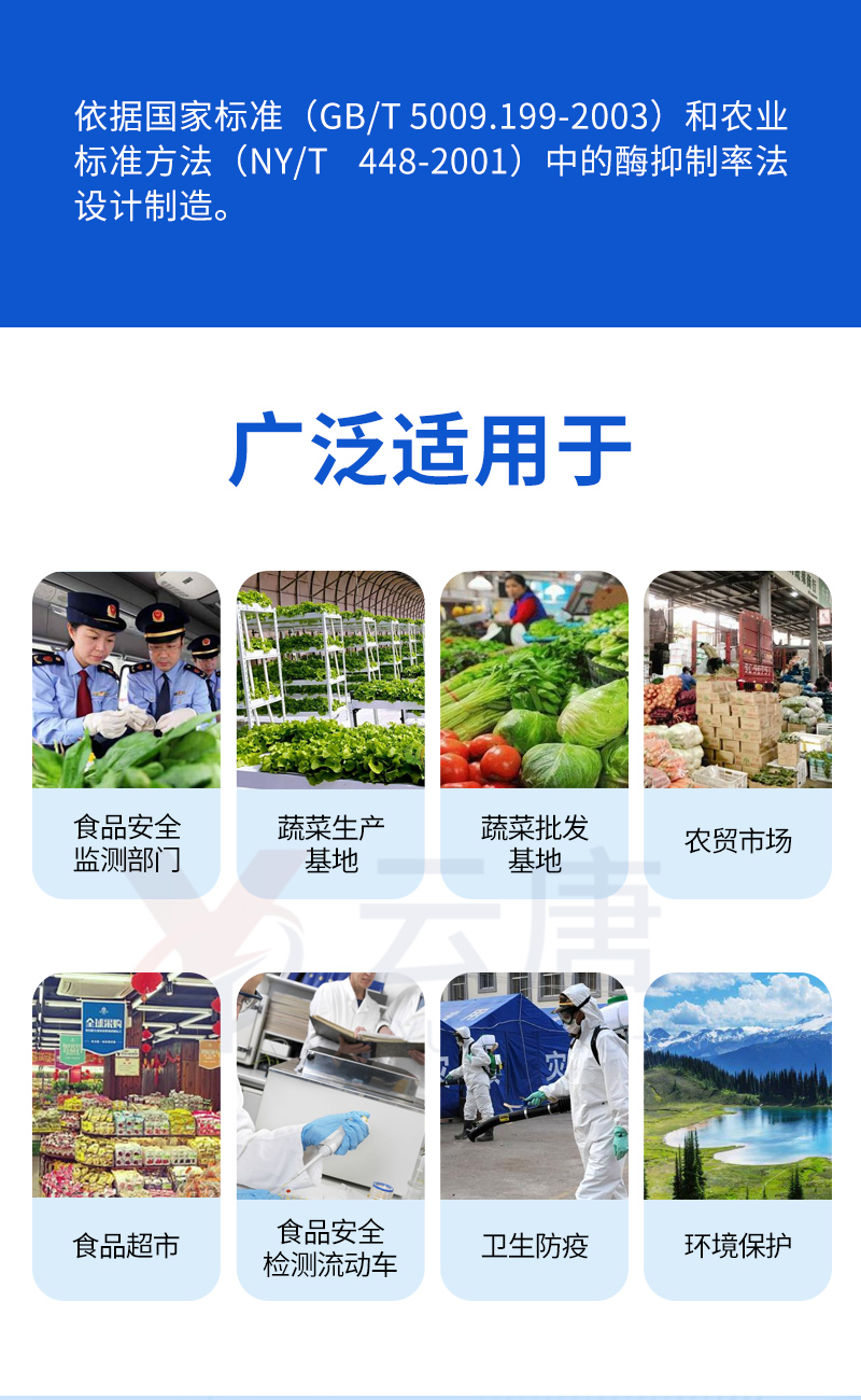 該儀器依據(jù)國家標準(GB/T 5009.199-2003)和農(nóng)業(yè)標準方法(NY/T 448-2001)中的酶抑制率法設(shè)計制造,能準確、快速檢測出蔬菜、水果、農(nóng)產(chǎn)品、茶葉等固體或液體中有機磷和氨基甲酸酯類農(nóng)藥殘留量。廣泛適用于各級食品安全監(jiān)測部門、蔬菜生產(chǎn)基地、蔬菜批發(fā)基地、農(nóng)貿(mào)市場、食品超市、各單位食堂、食品安全檢測流動車、衛(wèi)生防疫、環(huán)境保護等領(lǐng)域。