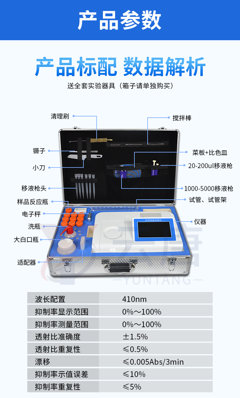檢測(cè)標(biāo)準(zhǔn):依據(jù)國(guó)家標(biāo)準(zhǔn)方法(GB/T5009.199-2003)以及世界衛(wèi)生組織WHO、世界糧農(nóng)組織FAO殘留農(nóng)藥檢測(cè)標(biāo)準(zhǔn)、世界環(huán)境保護(hù)局EPA參照攝入量等要求來(lái)設(shè)計(jì)。采用酶抑制率比色法對(duì)水果、蔬菜等農(nóng)林產(chǎn)品中有機(jī)磷和氨基甲酸酯類農(nóng)藥含量進(jìn)行快速準(zhǔn)確的檢測(cè),乙酰膽堿酯酶和丁酰膽堿酯酶試劑均可以使用,符合國(guó)家標(biāo)準(zhǔn)和農(nóng)業(yè)部標(biāo)準(zhǔn)的要求。