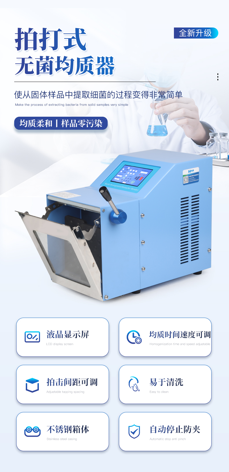 無菌均質(zhì)器使從固體樣品中提取細(xì)菌的過程變得非常簡單,只需將樣品和稀釋液加入到無菌的樣品袋中,然后將樣品袋放入拍擊式均質(zhì)器中即可完成樣品的處理。有效地分離被包含在固體樣品內(nèi)部和表面的微生物均一樣品,確保無菌袋中混合全部的樣品。處理后的樣品溶液可以直接進(jìn)行取樣和分析,沒有樣品的變化和交叉污染的危險。