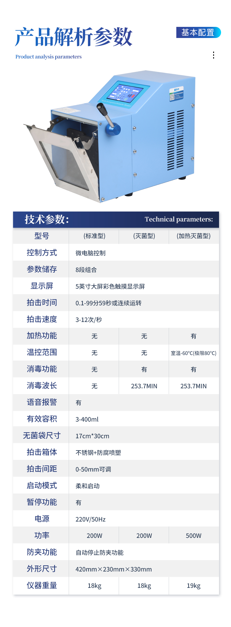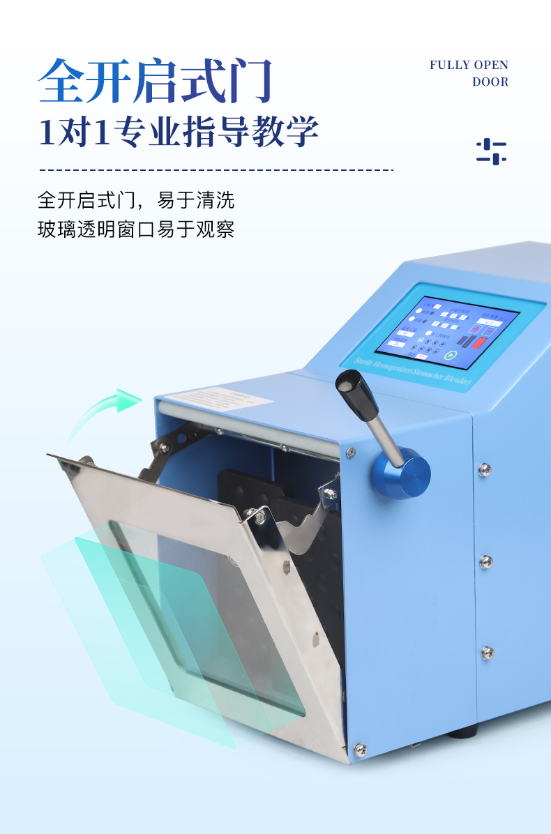 ●5英寸液晶顯示屏。 ●可儲存三組工作程序。 ●可調(diào)整的均質(zhì)時間。 ●均質(zhì)速度可調(diào)節(jié)或固定。 ●拍擊器可調(diào)整前后距離。 ●無菌一次性濾袋,保證衛(wèi)生。 ●全開啟式門,易于清洗。 ●玻璃透明窗口易于觀察 。 ●樣品與均質(zhì)儀無接觸,如無樣品泄露則不需進(jìn)行系統(tǒng)清洗. ●均質(zhì)柔和、樣品零污染、無損傷、不升溫、不需要滅菌處理,不需洗刷器皿。