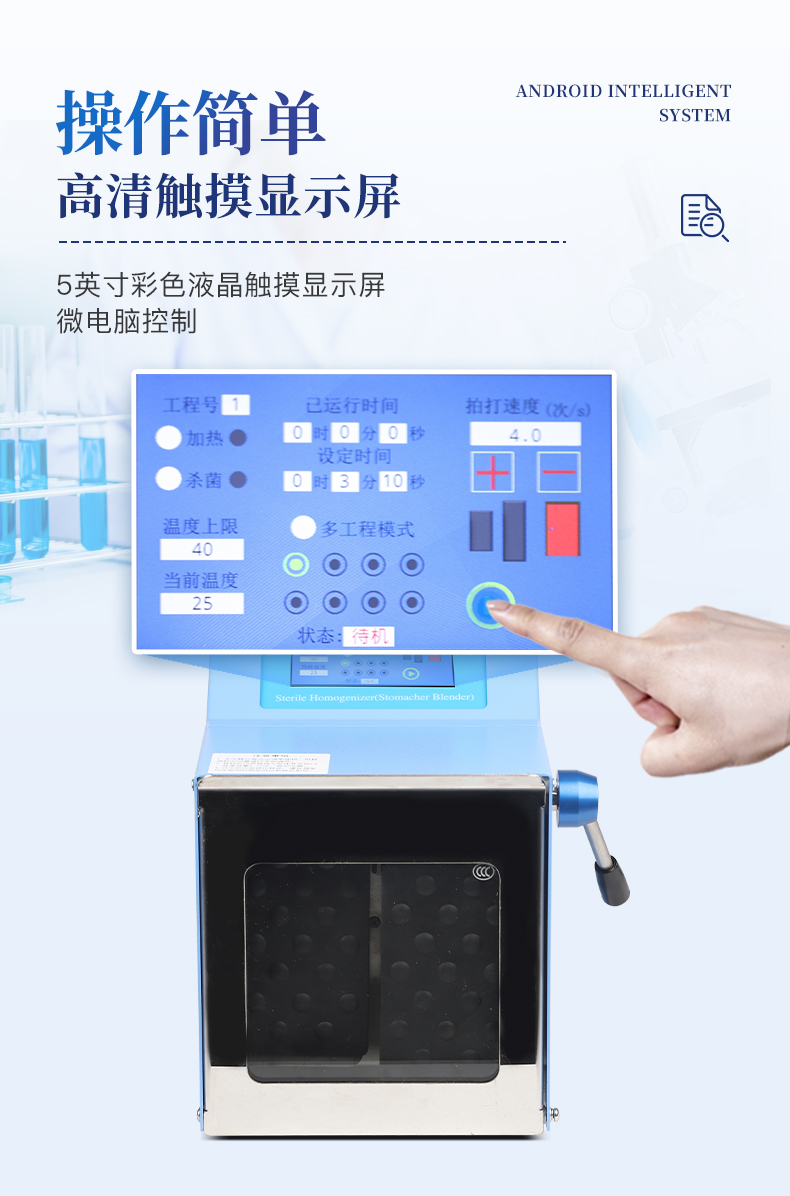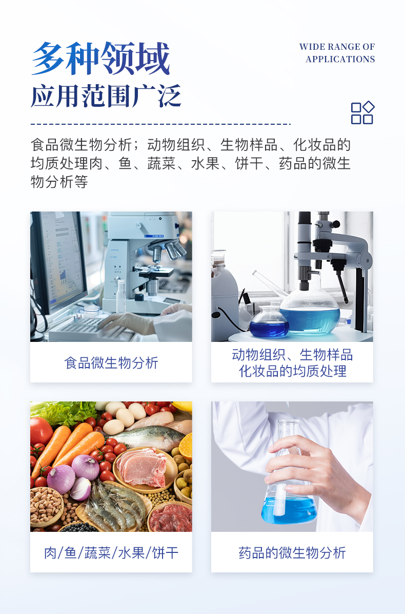 應(yīng)用領(lǐng)域:食品微生物分析;動物組織、生物樣品、化妝品的均質(zhì)處理;肉、魚、蔬菜、水果、餅干;藥品的微生物分析等;