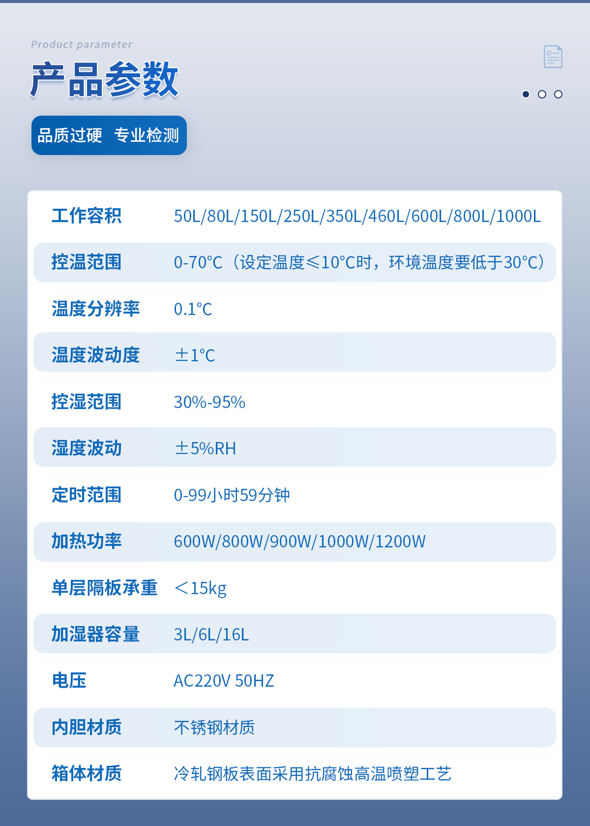 | 工作容積:70L | 控溫范圍:0-70℃(設(shè)定溫度≤10℃時,環(huán)境溫度要低于30℃) | 程序控制:24段 | 溫度分辨率:0.1℃ | 溫度波動度:±0.5℃ | 控濕范圍:30%-95% | 濕度波動:±5%RH | 定時范圍:0-99小時59分鐘 | 加熱功率:600W | 內(nèi)箱尺寸 寬*深*高(cm): 41*31*55 | 外箱尺寸 寬*深*高(cm):58*56*120 | 隔板層數(shù)(標配):2層 | 層間隔/mm:39 | 卡槽層數(shù):8 | 加濕器容量(標配):3L | 單層隔板承重:<10kg | 底部總承重 :25kg | 電壓:AC220V 50HZ | 整機重量:64kg | 內(nèi)膽材質(zhì):8K鏡面不銹鋼 | 箱體材質(zhì):冷軋鋼板表面采用抗腐蝕高溫噴塑工藝 | 旗艦款升級項目:升級內(nèi)置鋼化玻璃門,內(nèi)置220V電源插座。 |