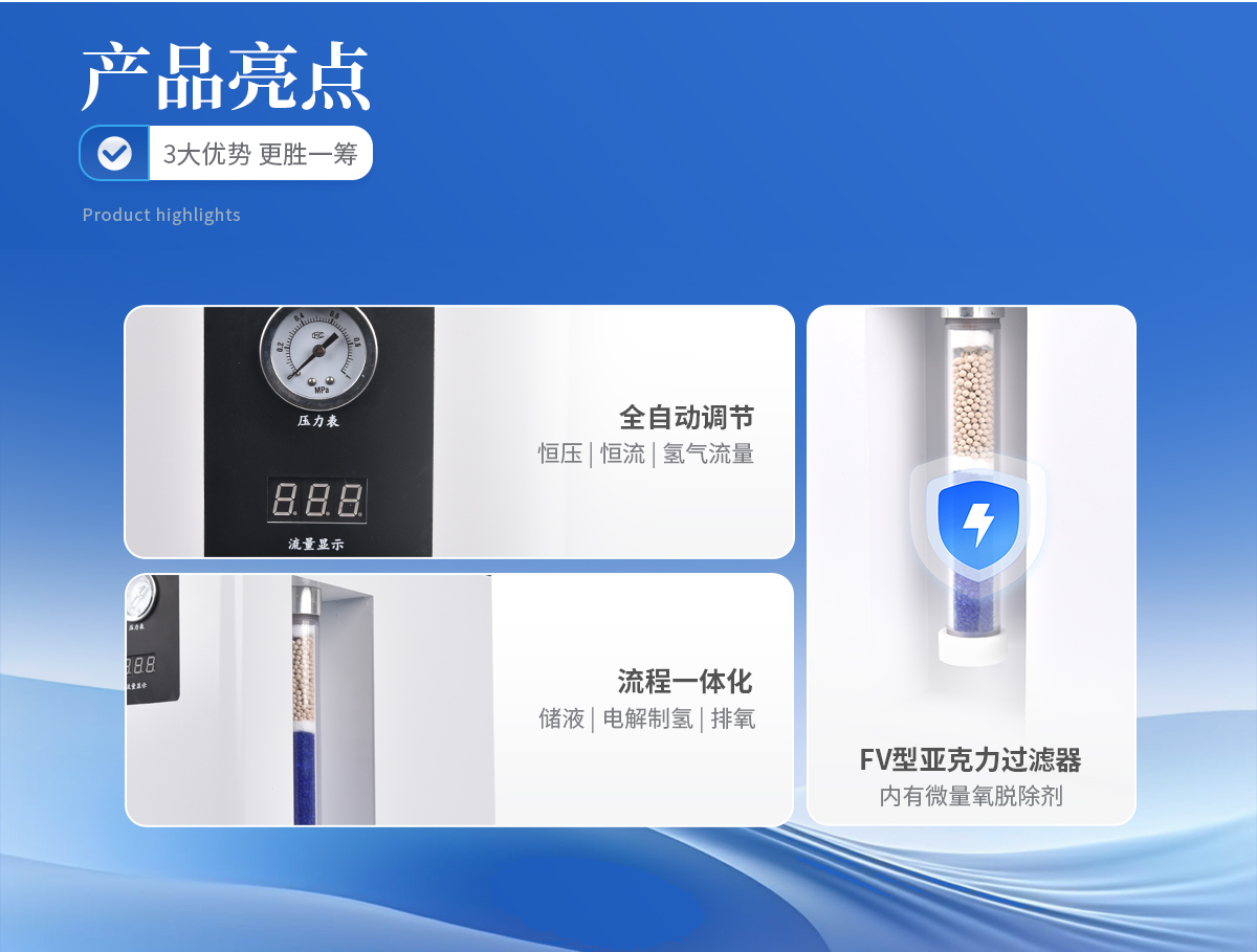 1、壓力、流量自動顯示,自動恒壓、恒流、氫氣流量可根據(jù)用量實(shí)現(xiàn)全自動調(diào)節(jié)。 2、FV型亞克力過濾器,內(nèi)有微量氧脫除劑(不需要活化),氫氣純度更高;儀器內(nèi)部采用硅橡膠圈(含硫量低),有效提高氣體質(zhì)量,保證色譜基線平穩(wěn)。 3、儲液、電解制氫、排氧一體化,池溫低,壽命長久。 4、配有安全裝置,靈敏可靠,自動防返堿。