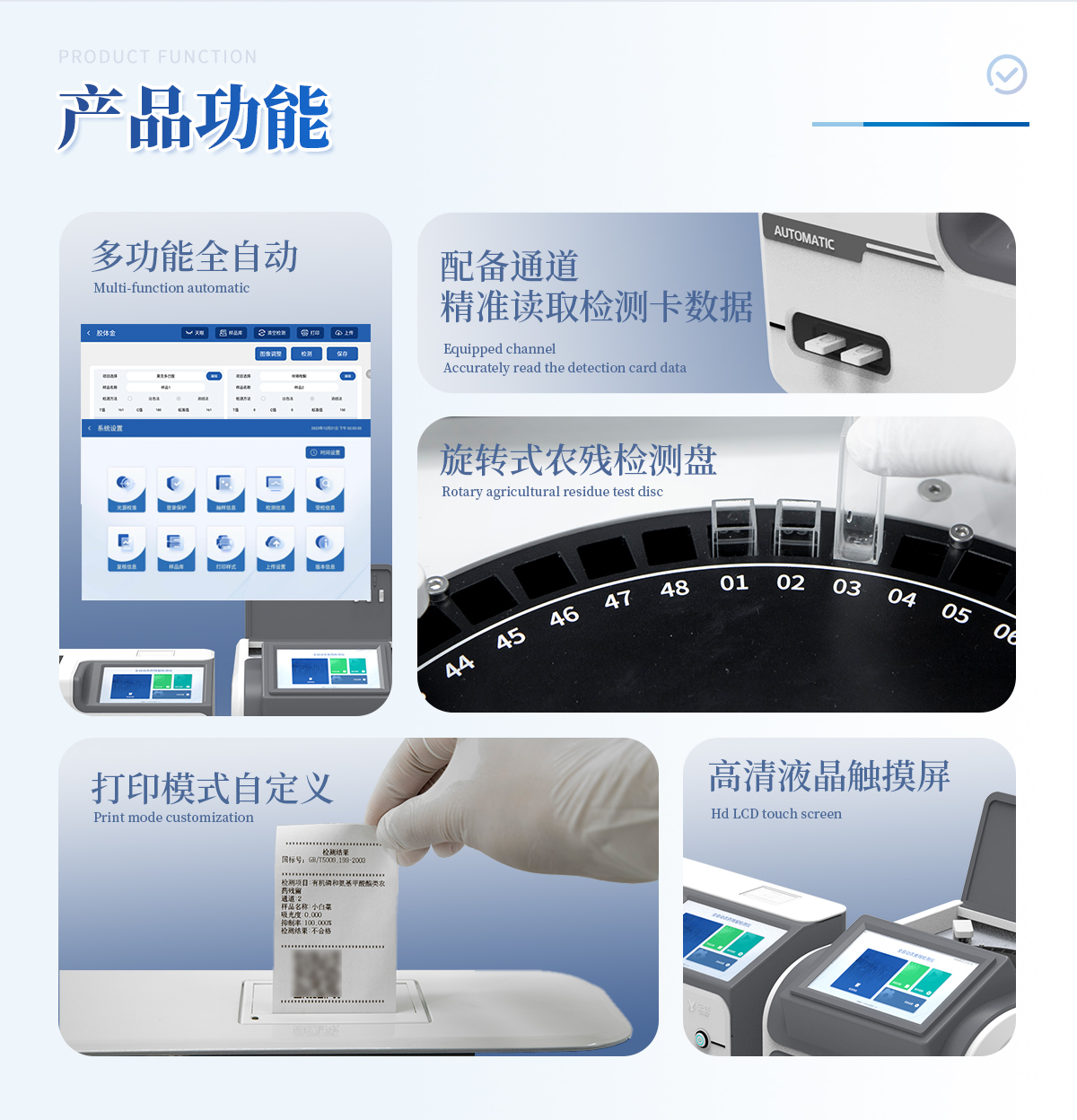 | 1. 試劑位置:3個(gè) | 2. 農(nóng)殘檢測(cè)盤:旋轉(zhuǎn)24通道比色盤,可任意選擇檢測(cè)通道,自動(dòng)對(duì)應(yīng)選擇通道。 | 3. 膠體金通道:2個(gè),可讀取檢測(cè)卡結(jié)果,自動(dòng)采集、處理分析,自動(dòng)判斷檢測(cè)結(jié)果,并具備自動(dòng)判空功能。 | 4.系統(tǒng)配置:10.1寸高清液晶觸摸屏,采用ARM Cortex?-A7,RK3288/4核處理器,運(yùn)行內(nèi)存1GB。Android7.1.1 系統(tǒng)分辨率1280×800。 | 5.恒溫系統(tǒng):具有自動(dòng)加溫溫控系統(tǒng),精準(zhǔn)恒溫37℃,精度±0.1℃。 | 6.添加系統(tǒng):儀器按照試劑要求自動(dòng)、按時(shí)、按量加入試劑,并且自動(dòng)對(duì)未正常放置的樣本或異常的樣本進(jìn)行檢查并提示。 | 7.清洗功能:儀器具備回流及自動(dòng)清洗管路功能,避免試劑污染。 | 8.混勻功能:設(shè)備具備自動(dòng)混勻功能。 | 9.光源校準(zhǔn):設(shè)備可自動(dòng)校準(zhǔn),確保檢測(cè)準(zhǔn)確度。 | 10.實(shí)時(shí)監(jiān)控:儀器測(cè)試過程中屏幕顯示運(yùn)行狀態(tài),可實(shí)時(shí)查看。 | 11.數(shù)據(jù)存儲(chǔ):內(nèi)部存儲(chǔ)16GB,可存儲(chǔ)500萬條數(shù)據(jù)。 | 12.樣品多選功能:設(shè)備具備樣品一鍵多選功能,選擇樣品自動(dòng)匹配檢測(cè)通道。 | 13.項(xiàng)目預(yù)設(shè):可提前設(shè)置單個(gè)及多個(gè)相同或不相同的檢測(cè)任務(wù),可單次或者多次調(diào)取,減少檢測(cè)時(shí)間。 | 14.自定義打印系統(tǒng):內(nèi)置自定義打印系統(tǒng),可按需靈活設(shè)置開啟或關(guān)閉:產(chǎn)品合格證(國(guó)家農(nóng)業(yè)部標(biāo)準(zhǔn)),二維碼,抽樣信息、檢測(cè)信息,受檢信息等信息的打印。 | 15.A4版本報(bào)告打印功能:設(shè)備可自動(dòng)生成A4版報(bào)告,A4報(bào)告帶二維碼,可掃描二維碼生成電子版,并可識(shí)別真?zhèn)巍?/td> | 16.傳輸方式:儀器配備無線通信模塊: 4G(APN)通訊模塊、Wifi模塊,藍(lán)牙傳輸模塊,同時(shí)具有USB接口以及RJ45接口能以多種方式實(shí)現(xiàn)數(shù)據(jù)保存和數(shù)據(jù)傳輸功能,設(shè)備數(shù)據(jù)可以同步上傳至平臺(tái)。 | 17.系統(tǒng)17.數(shù)據(jù)監(jiān)管系統(tǒng):設(shè)備自帶監(jiān)管平臺(tái),并可同步對(duì)接監(jiān)管平臺(tái),數(shù)據(jù)可局域網(wǎng)和互聯(lián)網(wǎng)數(shù)據(jù)上傳,檢測(cè)結(jié)果可直接傳至食品安全監(jiān)管平臺(tái)。達(dá)到食品安全問題預(yù)估、預(yù)警。 | 18.系統(tǒng)遠(yuǎn)程更新功能:無需設(shè)備返廠,即可遠(yuǎn)程實(shí)時(shí)升級(jí)全新系統(tǒng),節(jié)省時(shí)間成本及避免運(yùn)輸造成設(shè)備損。 |