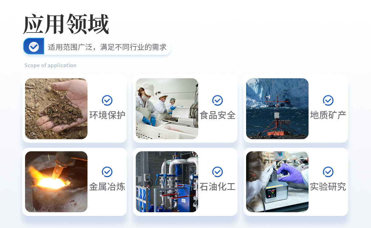 原子熒光光譜儀的應(yīng)用領(lǐng)域較為廣泛,主要測試樣品中 11 種超痕量元素的含量,**檢測下限可達(dá)千億分之一級。應(yīng)用領(lǐng)域包括水質(zhì)、土壤、大氣等樣環(huán)境檢測項目、食品檢驗(yàn)、檢驗(yàn)檢疫、藥品檢驗(yàn)、化妝品檢驗(yàn)、土壤飼料肥料檢驗(yàn)、地質(zhì)礦產(chǎn)測試、冶金樣品檢驗(yàn)、教學(xué)研究等。