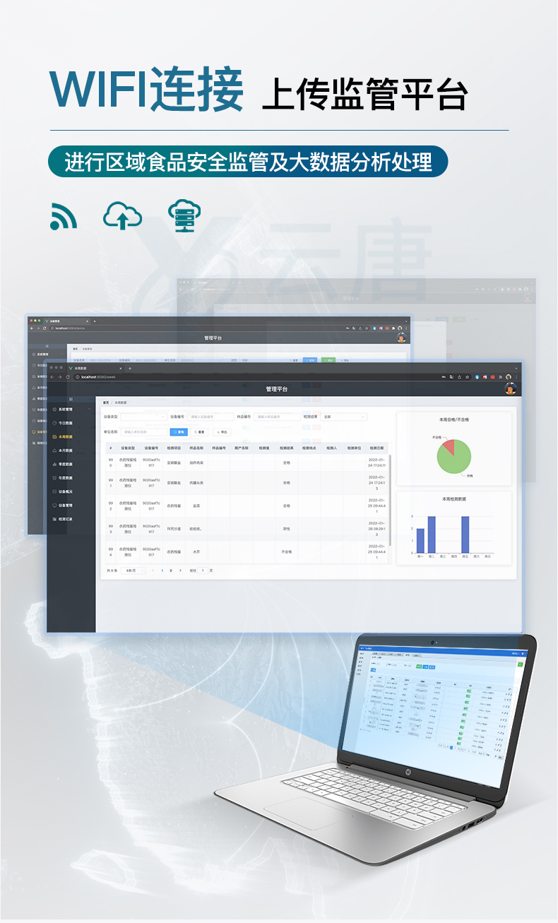 9.6、數(shù)據(jù)監(jiān)管系統(tǒng):同步對接監(jiān)管平臺,數(shù)據(jù)可局域網(wǎng)和互聯(lián)網(wǎng)數(shù)據(jù)上傳,檢測結(jié)果可選擇直接傳至食品安全監(jiān)管平臺。進行區(qū)域食品安全監(jiān)管及大數(shù)據(jù)分析處理與數(shù)據(jù)統(tǒng)計,檢測區(qū)域食品安全長短期動態(tài),達到食品安全問題預估、預警。