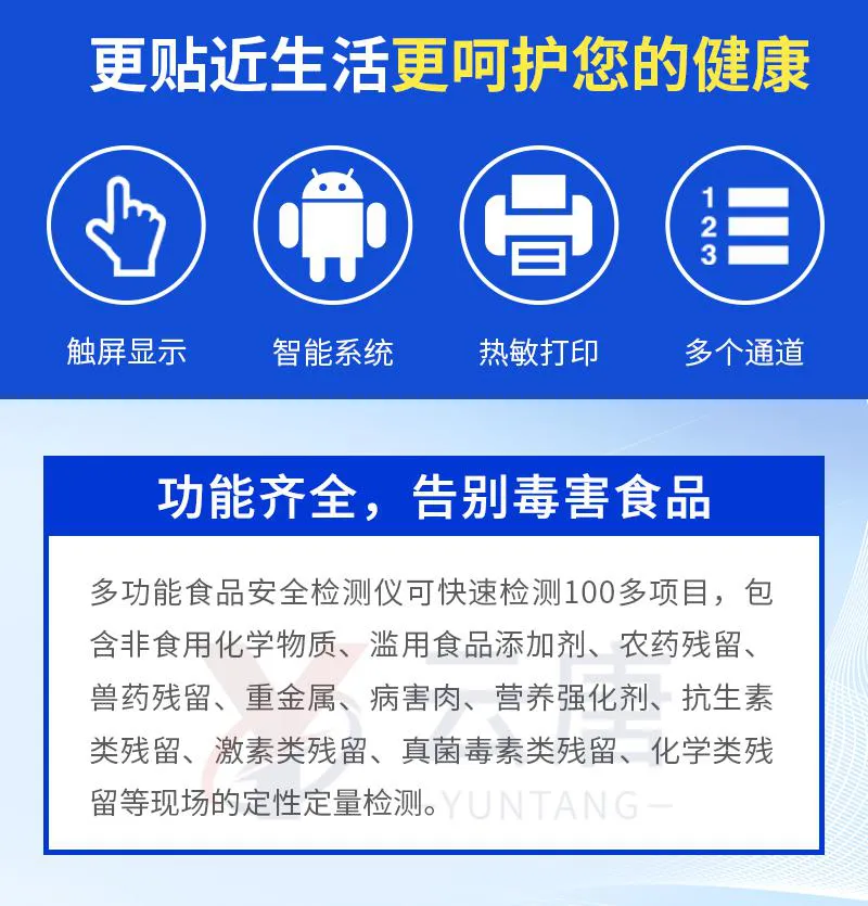 可快速檢測(cè)各類食品中的甲醛、二氧化硫、亞硝酸鹽的含量,儀器預(yù)留其他項(xiàng)目檢測(cè)程序和端口,根據(jù)日后需求可方便的自主增加檢測(cè)項(xiàng)目。