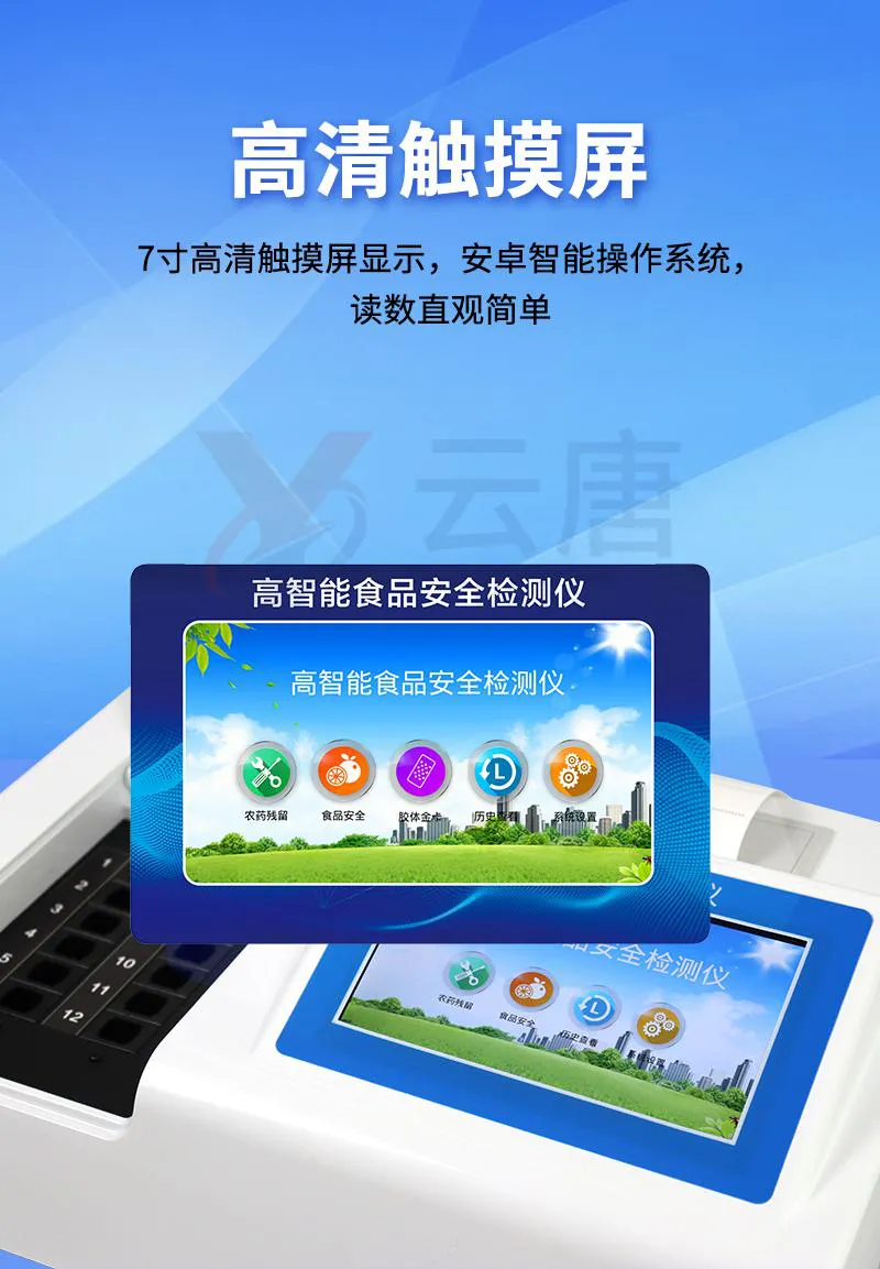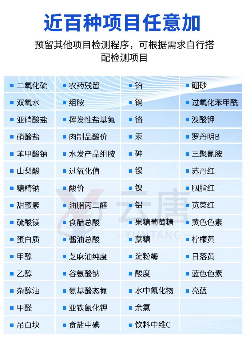 可快速檢測(cè)各類(lèi)食品中的甲醛、吊白塊、二氧化硫、亞硝酸鹽、雙氧水、硼砂、農(nóng)藥殘留、乳及乳制品中蛋白質(zhì)的含量,儀器預(yù)留其他項(xiàng)目檢測(cè)程序和端口,根據(jù)日后需求可方便的自主增加檢測(cè)項(xiàng)目。
