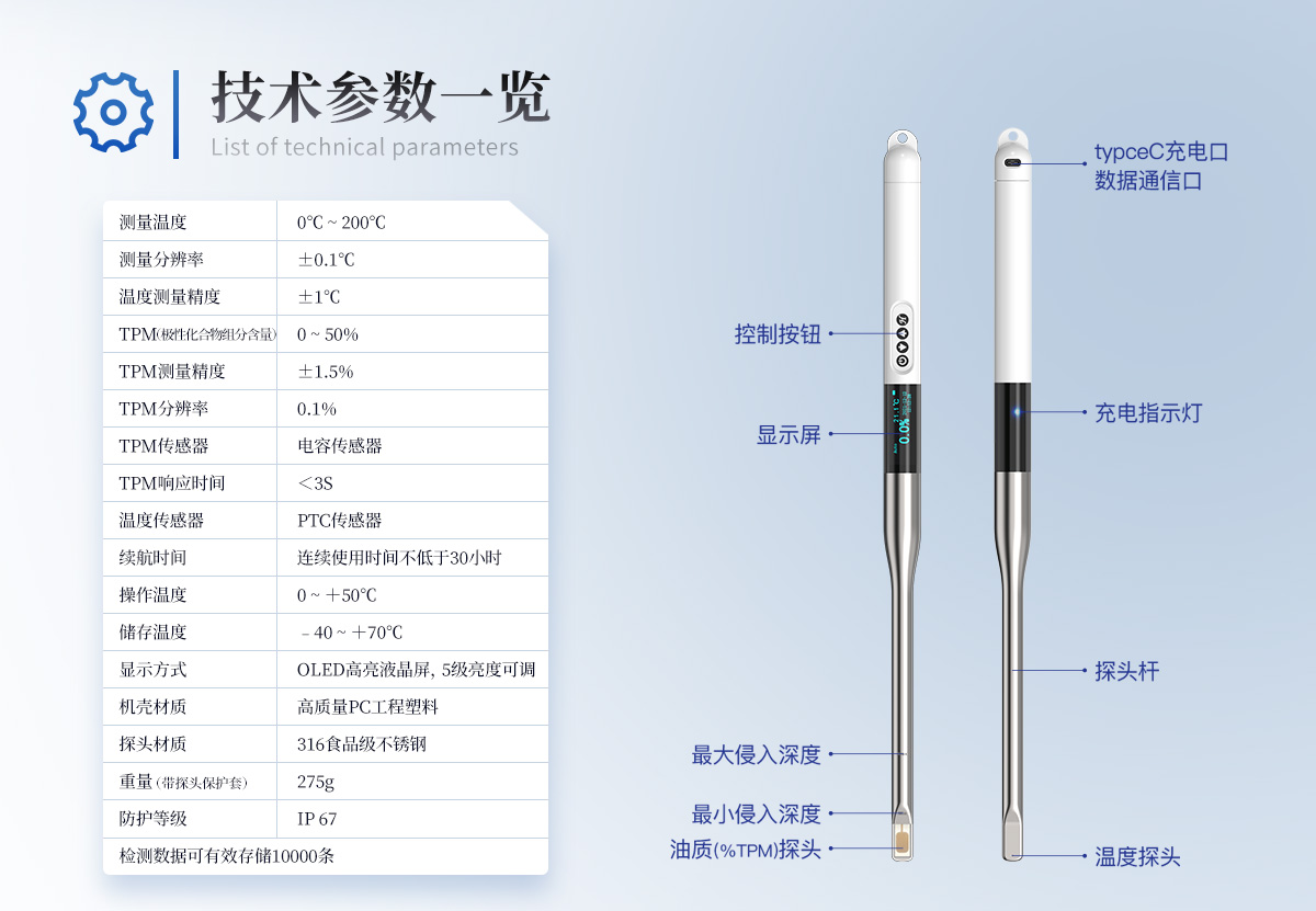 食用油脂是人們攝取能量和營養(yǎng)的重要來源,是加工食品的重要原料。油炸食品以其特有風(fēng)味廣受消費者喜歡。用于煎炸的食用油在高溫煎炸過程中發(fā)生一系列的物理、化學(xué)變化,這些變化會生成對身體健康有害的物質(zhì)。目前,煎炸食用油的傳統(tǒng)檢測方法多為化學(xué)方法,這些方法必須在實驗室內(nèi)由專業(yè)人員操作,費時費力,化學(xué)試劑的使用可能會傷害檢測人員健康,且化學(xué)廢劑污染了環(huán)境。LH-SYP是一種快速,安全,**食用油品質(zhì)檢測儀,能夠快速檢測食用油中的極性化合物組分(TPM)含量。本產(chǎn)品能夠在油溫較高的環(huán)境下使用,適用于各種煎炸的食用油品質(zhì)檢驗。