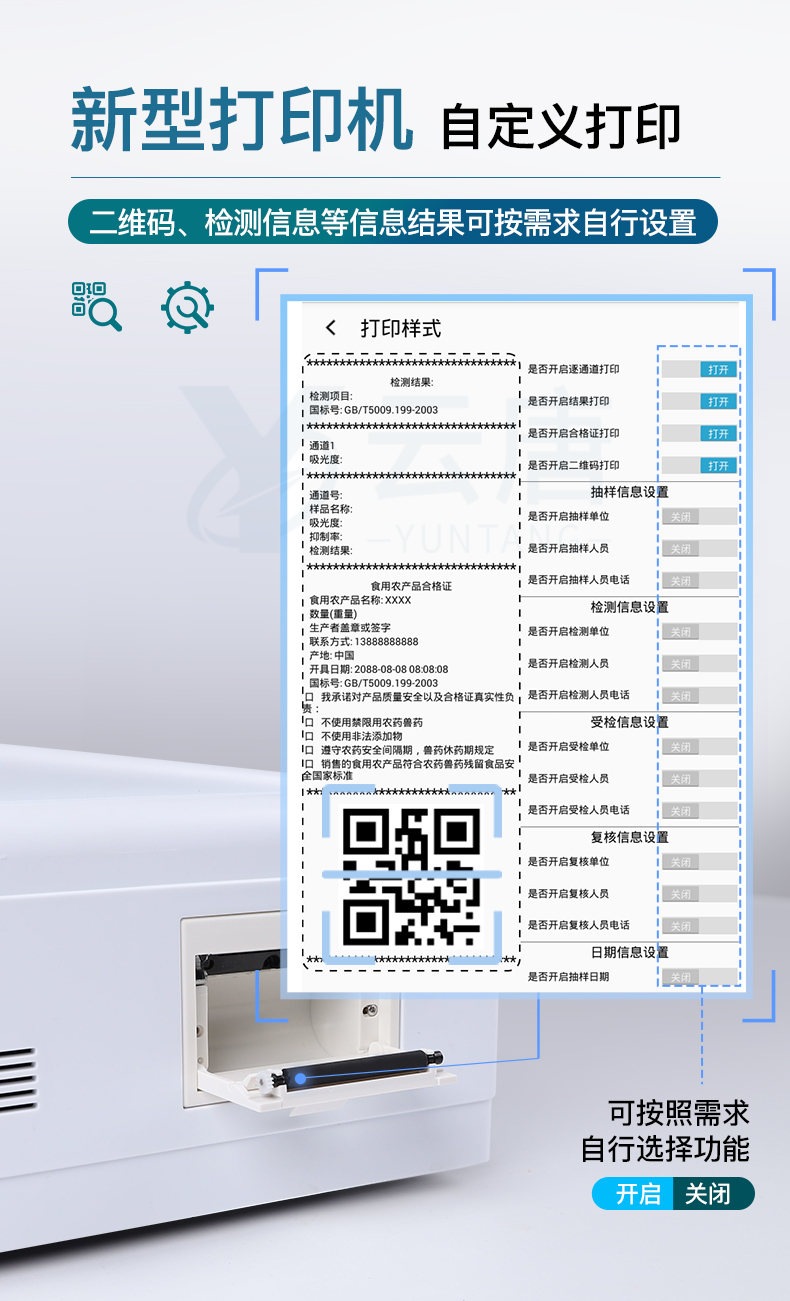 9.7.1、全新打印系統(tǒng):內(nèi)置全新打印機(jī),新創(chuàng)自定義打印方式,可按需靈活勾選控制:產(chǎn)品合格證(國家農(nóng)業(yè)部標(biāo)準(zhǔn)要求),二維碼,抽樣信息、檢測信息,受檢信息、復(fù)核信息、抽樣日期、檢測日期等信息的打印。