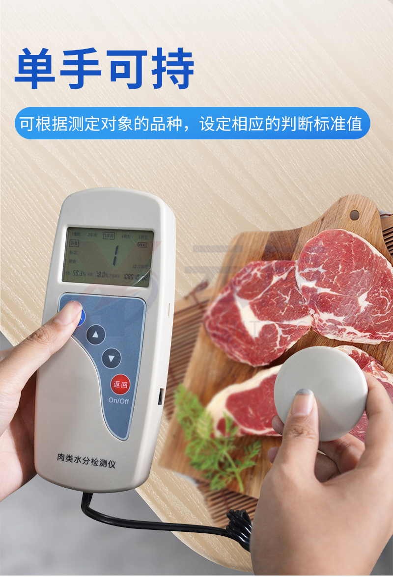 肉類水分檢測儀主要用于快速豬肉、牛肉、雞肉等動物肉類水分含量,從而判斷所測樣品是否為注水肉,該儀器設計精巧,單手可持,儀器可根據(jù)測定對象的品種,設定相應的判斷標準值。