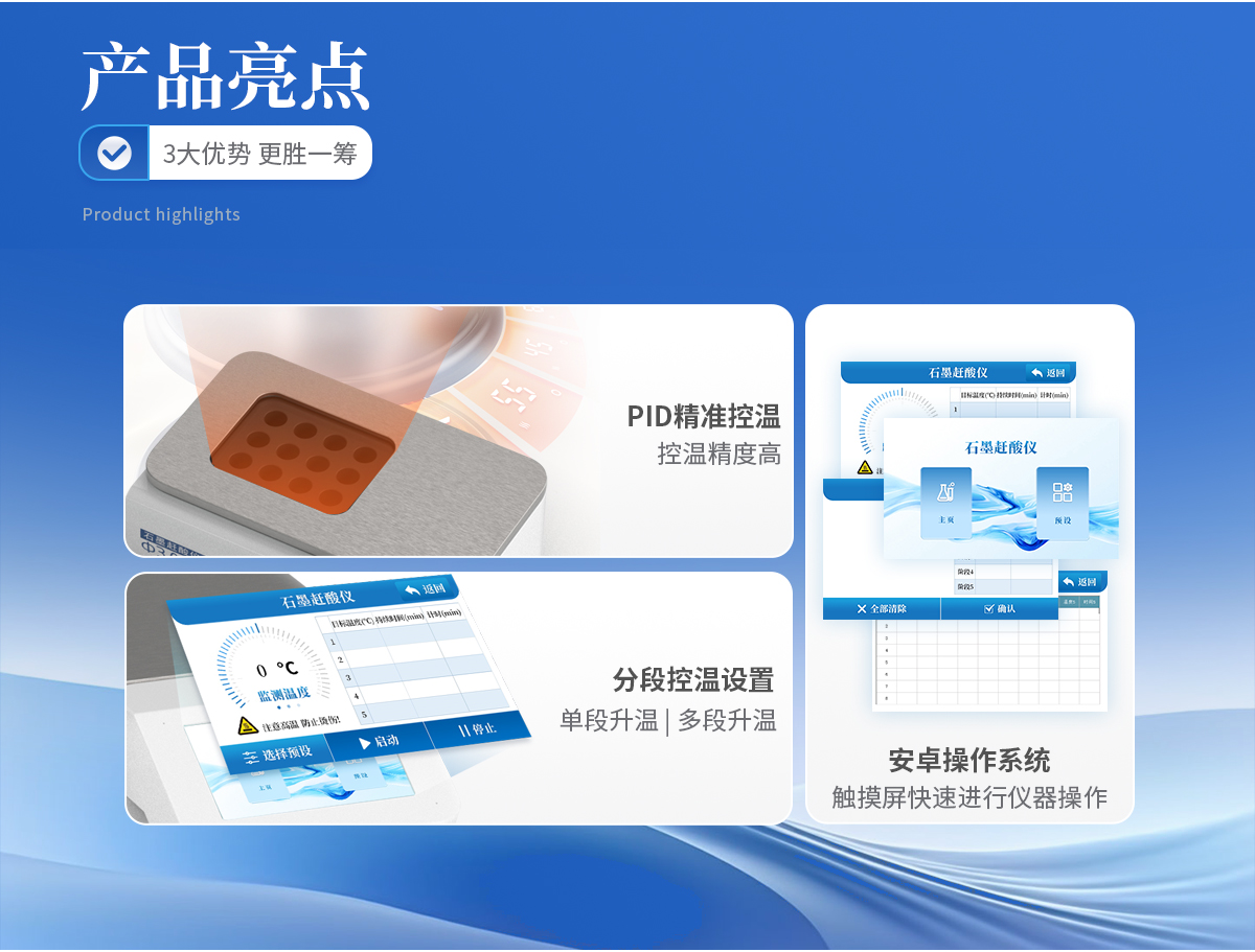 使用5寸彩色觸摸屏進(jìn)行儀器操作,配備安卓操作系統(tǒng),方便快捷。 采用PID 控溫技術(shù),控溫精度高,升溫速度快, 從室溫到260℃僅需25分鐘。 分段控溫設(shè)置,即可單段升溫,也可多段升溫,設(shè)置靈活,儀器將自動(dòng)按順序完成。更適于易產(chǎn)生泡沫的樣品。 采用優(yōu)質(zhì)石墨爐內(nèi)芯,平均溫差較小,樣品效果一致性好,熱傳導(dǎo)效率更高。石墨塊具有特氟龍涂層,耐腐蝕,延長(zhǎng)使用壽命。