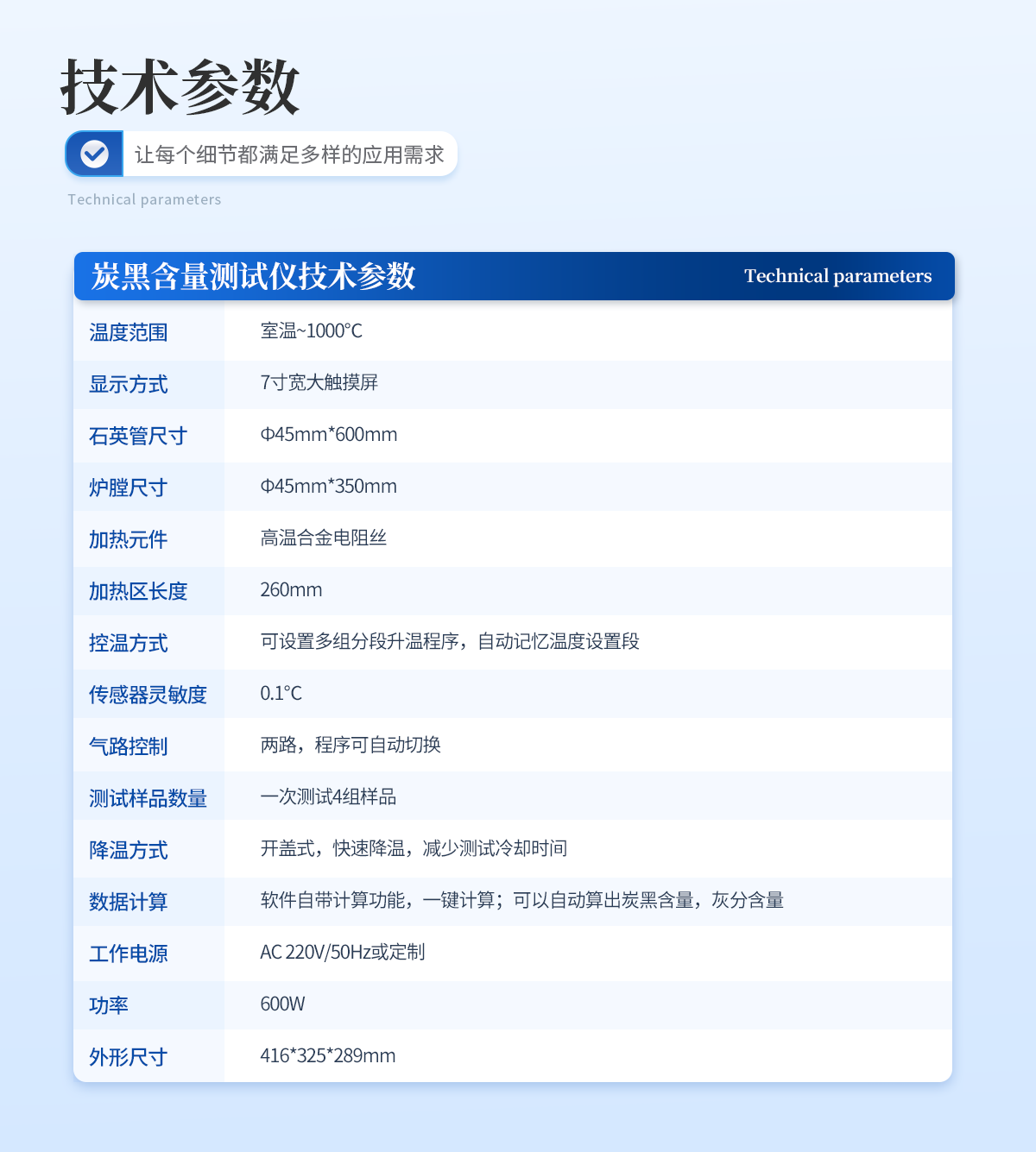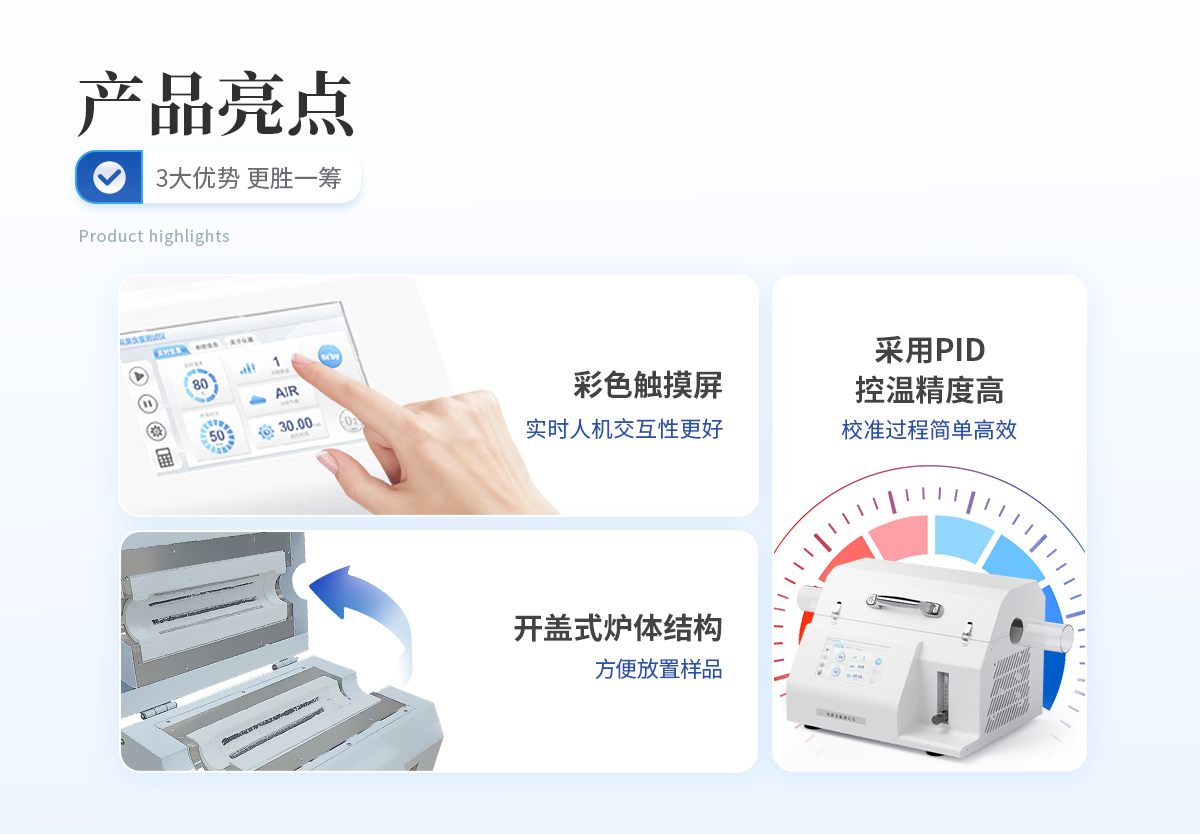 | 1. 采用開蓋式爐體結(jié)構(gòu),方便放置樣品且散熱效果更佳。 | 2. 爐膛采用超長加熱單元,可同時測試4組樣品,大大提高測試效率。 | 3. 軟件自帶計算功能,可以一鍵自動計算出炭黑含量、灰分含量,非常得方便快捷。 | 4. 采用PID精準(zhǔn)控溫,控溫精度高,溫度范圍大,爐膛溫度均勻性高。 | 5. 7寸液晶觸摸屏顯示,可一鍵操作啟動,設(shè)定恒溫時間,恒溫精度高; | 6. 智能化可編程控制,可設(shè)置多組分段升溫程序。 |