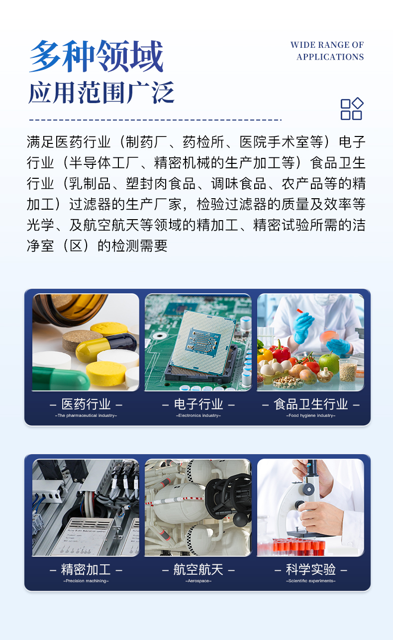 滿足醫(yī)藥行業(yè)(制藥廠、藥檢所、醫(yī)院手術(shù)室等);電子行業(yè)(半導(dǎo)體工廠、精密機(jī)械的生產(chǎn)加工等);食品衛(wèi)生行業(yè)(乳制品、塑封肉食品、調(diào)味食品、農(nóng)產(chǎn)品等的精加工);過(guò)濾器的生產(chǎn)廠家,檢驗(yàn)過(guò)濾器的質(zhì)量及效率等;光學(xué)、及航空航天等領(lǐng)域的精加工、精密試驗(yàn)所需的潔凈室(區(qū))的檢測(cè)需要。