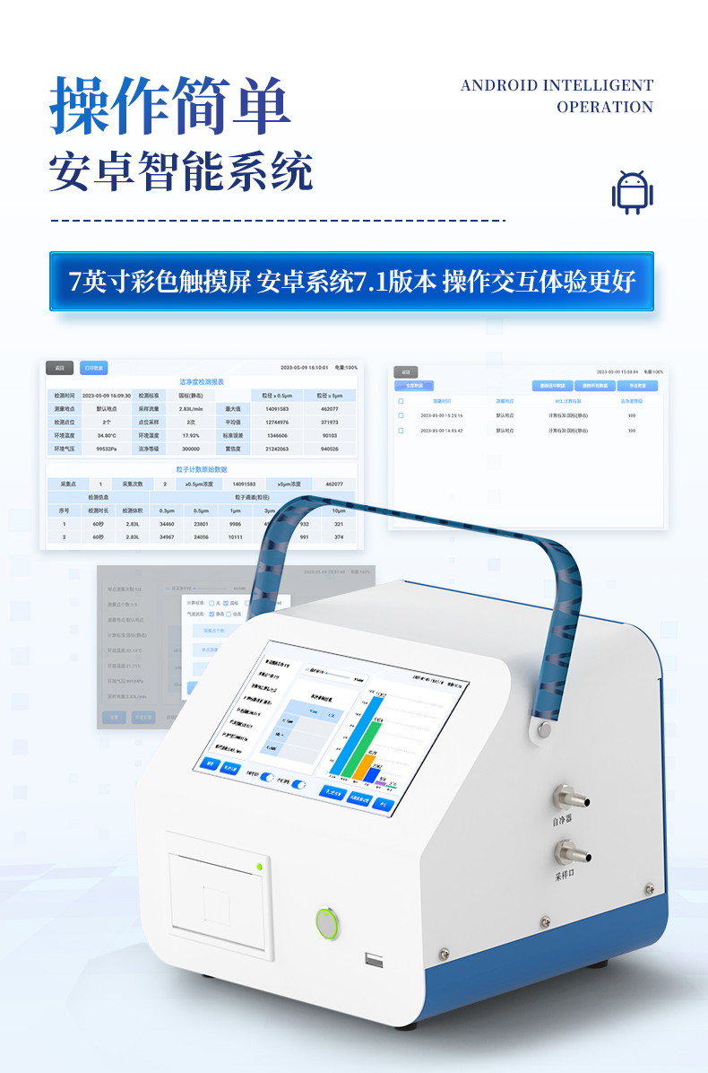 1、安卓系統(tǒng)7.1版本,操作交互體驗(yàn)更好。 2、內(nèi)置溫濕度傳感器、環(huán)境氣壓傳感器 3、核心部件光散射傳感器明顯消除腔體的雜散光,信噪比大為提高。從而使測(cè)量更準(zhǔn)確更可靠。 4、按95%置信度(UCL)計(jì)算,計(jì)數(shù)結(jié)果可換算成m3和ft3 5、依照凈化級(jí)別劃分和規(guī)定,自動(dòng)判定凈化級(jí)別,使用便利。 6、帶審計(jì)追蹤功能,可查詢、可追溯、可控制,符合FDA 21CFR PART11規(guī)范 7、支持wifi、藍(lán)牙傳輸,數(shù)據(jù)可無(wú)線上傳;同時(shí)支持U盤拷貝數(shù)據(jù),免驅(qū)動(dòng)插拔。 8、配置監(jiān)管平臺(tái),檢測(cè)結(jié)果可直接無(wú)線傳至平臺(tái),進(jìn)行潔凈度長(zhǎng)短期分析,輔助管理。 9、內(nèi)置新一代高速熱敏打印機(jī),可選擇所需要打印的粒徑通道,靈活打印結(jié)果。 10、交直流兩用,內(nèi)置充電鋰電池,環(huán)保耐用可支持連續(xù)采樣6小時(shí)以上。 11、便捷簡(jiǎn)易伸縮式云臺(tái)支架,安裝采樣操作更加方便。