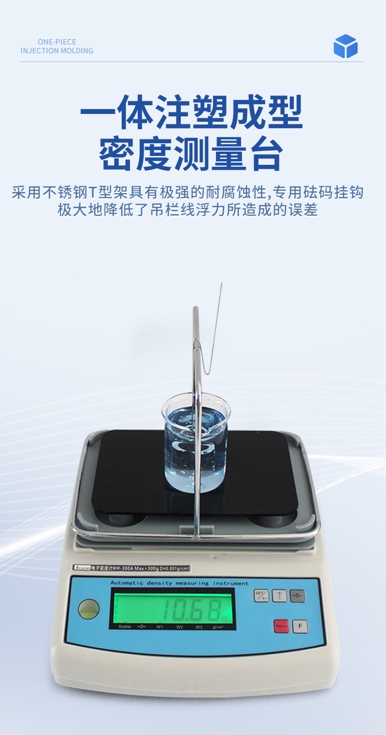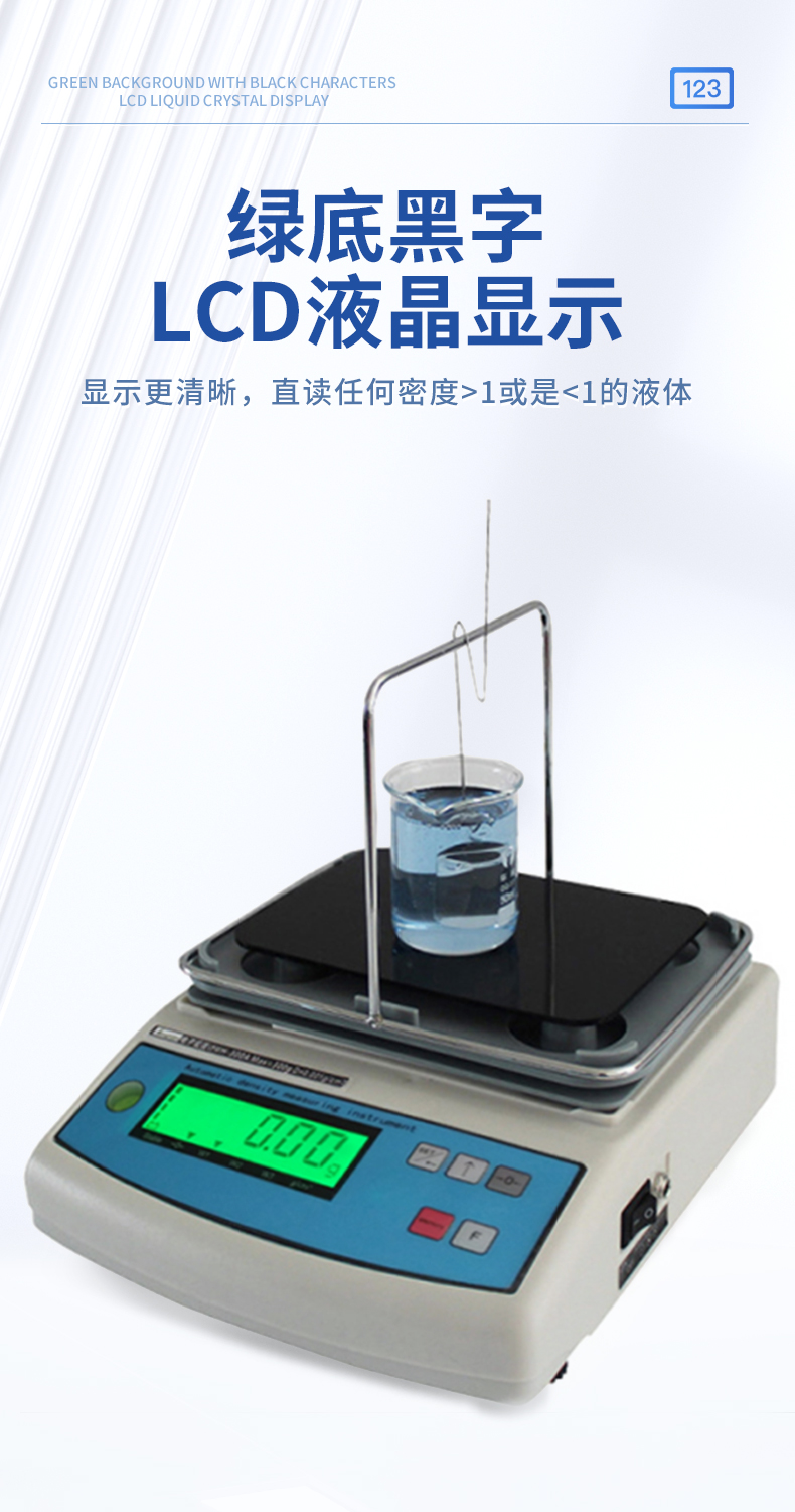 | 1.直讀任何密度>1或是<1的液體.> | 2.具有溫度補償設定、溶液補償設定功能,更人性化的操作、更符合現(xiàn)場作業(yè)需求 | 3.密度測量臺一體注塑成型,安裝方便快速,使用時間更長. | 4.采用不銹鋼T型架具有極強的耐腐蝕性,專用砝碼掛鉤極大地降低了吊欄線浮力所造成的誤差 | 5.具有密度上、下限功能,可判定待測物的比重合格與否。設有蜂鳴器裝置 | 6.內(nèi)置蓄電池,選配防風罩,更適合現(xiàn)場測試. | 7. 綠底黑字LCD液晶顯示,顯示更清晰 |