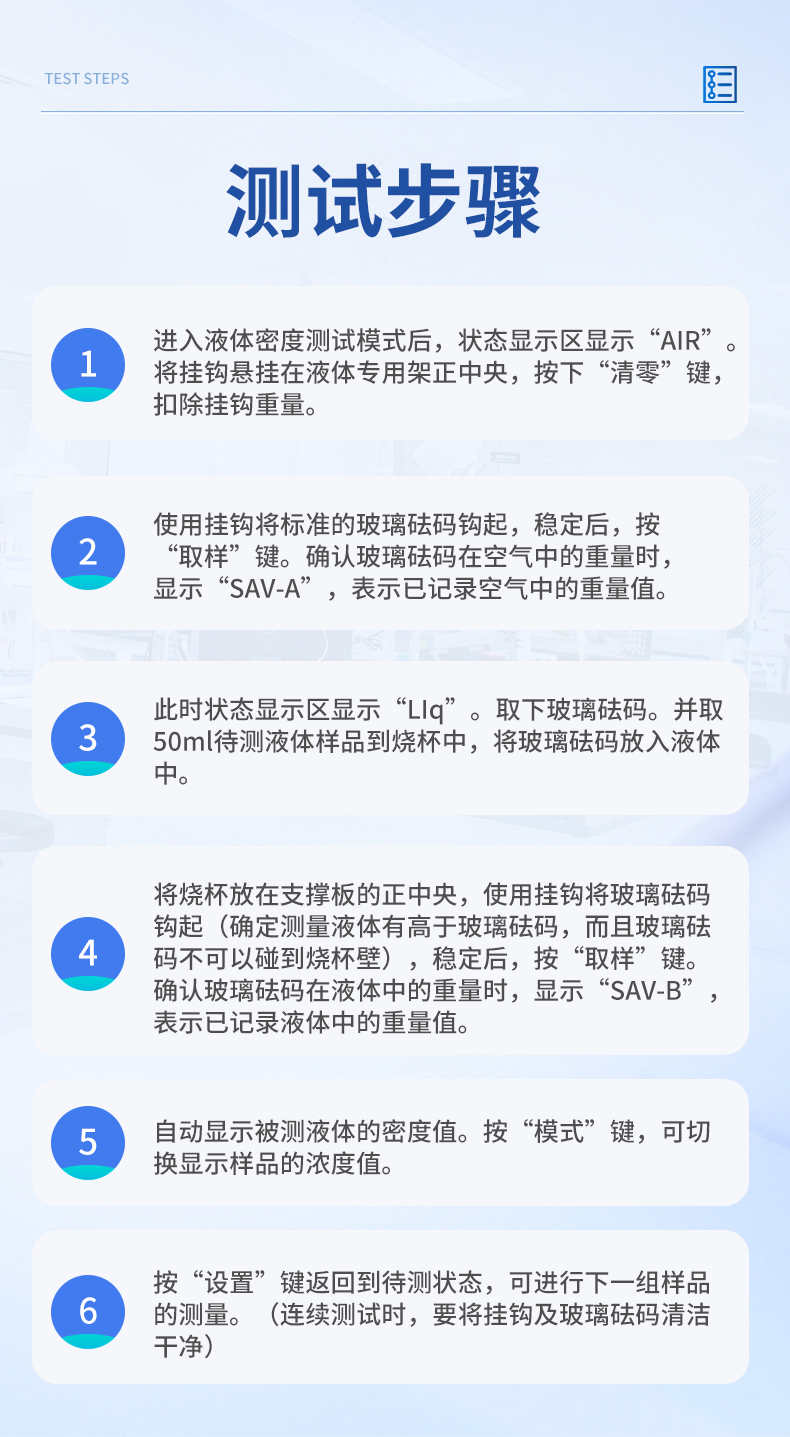 | 1、進入液體密度測試模式后,狀態(tài)顯示區(qū)顯示“AIR”。 將掛鉤懸掛在液體專用架正中央,按下“清零”鍵,扣除掛鉤重量。 | 2、使用掛鉤將標準的玻璃砝碼鉤起,穩(wěn)定后,按“取樣”鍵。確認玻璃砝碼在空氣中的重量時,顯示“SAV-A”,表示已記錄空氣中的重量值。 | 3、此時狀態(tài)顯示區(qū)顯示“LIq”。取下玻璃砝碼。并取50ml待測液體樣品到燒杯中,將玻璃砝碼放入液體中。 | 4、將燒杯放在支撐板的正中央,使用掛鉤將玻璃砝碼鉤起(確定測量液體有高于玻璃砝碼,而且玻璃砝碼不可以碰到燒杯壁),穩(wěn)定后,按“取樣”鍵。確認玻璃砝碼在液體中的重量時,顯示“SAV-B”,表示已記錄液體中的重量值。 | 5、自動顯示被測液體的密度值。按“模式”鍵,可切換顯示樣品的濃度值。 | 7、按“設置”鍵返回到待測狀態(tài),可進行下一組樣品的測量。(連續(xù)測試時,要將掛鉤及玻璃砝碼清潔干凈) | 儀器尺寸:195*220*190mm | 包裝尺寸:430*200*360mm | 包裝重量:4kg |