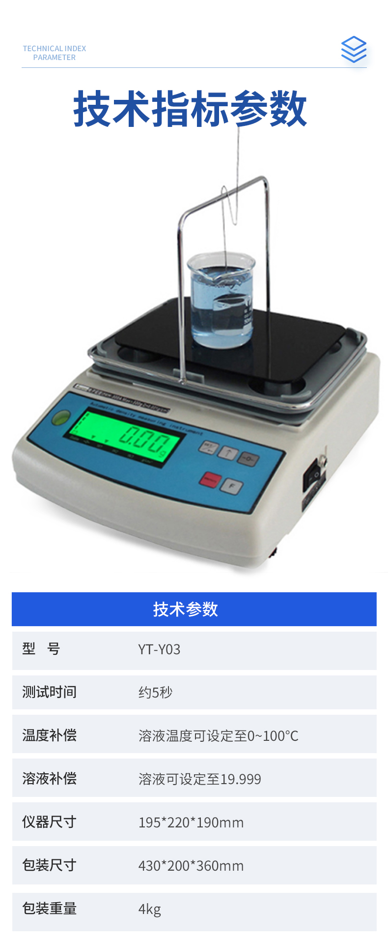 | YT-Y01 稱重范圍:0.01-300g 稱重精度:0.01g 密度精度:0.001g/cm3 | YT-Y02 稱重范圍:0.01-600g 稱重精度:0.01g 密度精度:0.001g/cm3 | YT-Y03 稱重范圍:0.005-300g 稱重精度:0.005g 密度精度:0.0001g/cm3 | 測試種類 化工溶液、化工助劑、現(xiàn)代能源、石油燃燒、藥劑、油漆涂料、瀝青、食用油等各種液體 | 測試時間 約5秒 | 顯示值 密度、體積 | 溫度補償 溶液溫度可設定至0~100℃ | 溶液補償 溶液可設定至19.999 |