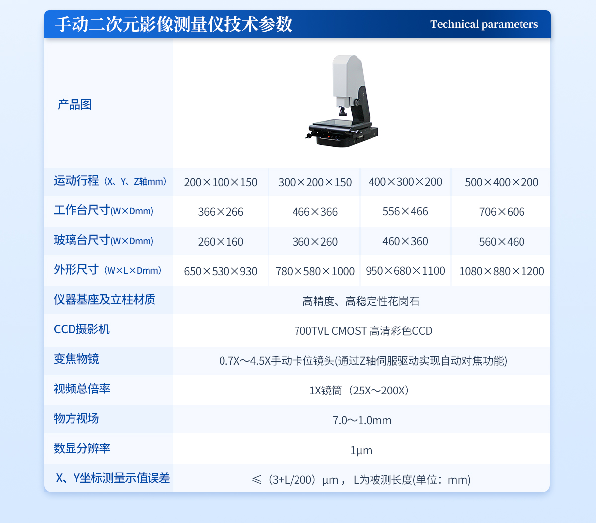 | l 運動行程(X、Y、Z軸mm):100×100×75 | l 工作臺呎寸(W×Dmm): 232×232 | l 玻璃臺呎寸(W×Dmm): 110×110 | l 外形尺寸(W×L×Dmm): 300×450×650 | l 工作距離:90mm | l 儀器材質(zhì): 高精度硬質(zhì)鋁基座+航空鋁工作臺 | l CCD攝影機(jī):COMST 700TVL模擬信號高清彩色CCD | l 變焦物鏡: 0.7X~4.5X連續(xù)變焦鏡頭 | l 視頻總倍率:1X鏡筒(25X~200X) | l 物方視場: 7.0~1.0mm | l 數(shù)顯分辨率:1μm | l X、Y坐標(biāo)測量示值誤差≤(3+L/200)μm , L為被測長度(單位:mm) | l 操作方式:手動移動平臺 |