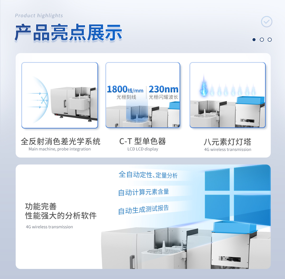 采用 1800 線/mm、閃耀波長 230nm 光柵分光系統(tǒng)。 3、 八元素?zé)魺羲?br/>一燈工作,*多可以七燈預(yù)熱,節(jié)省了換燈和預(yù)熱時間,使元素測量更加快捷方便。 4、 全自動化設(shè)計