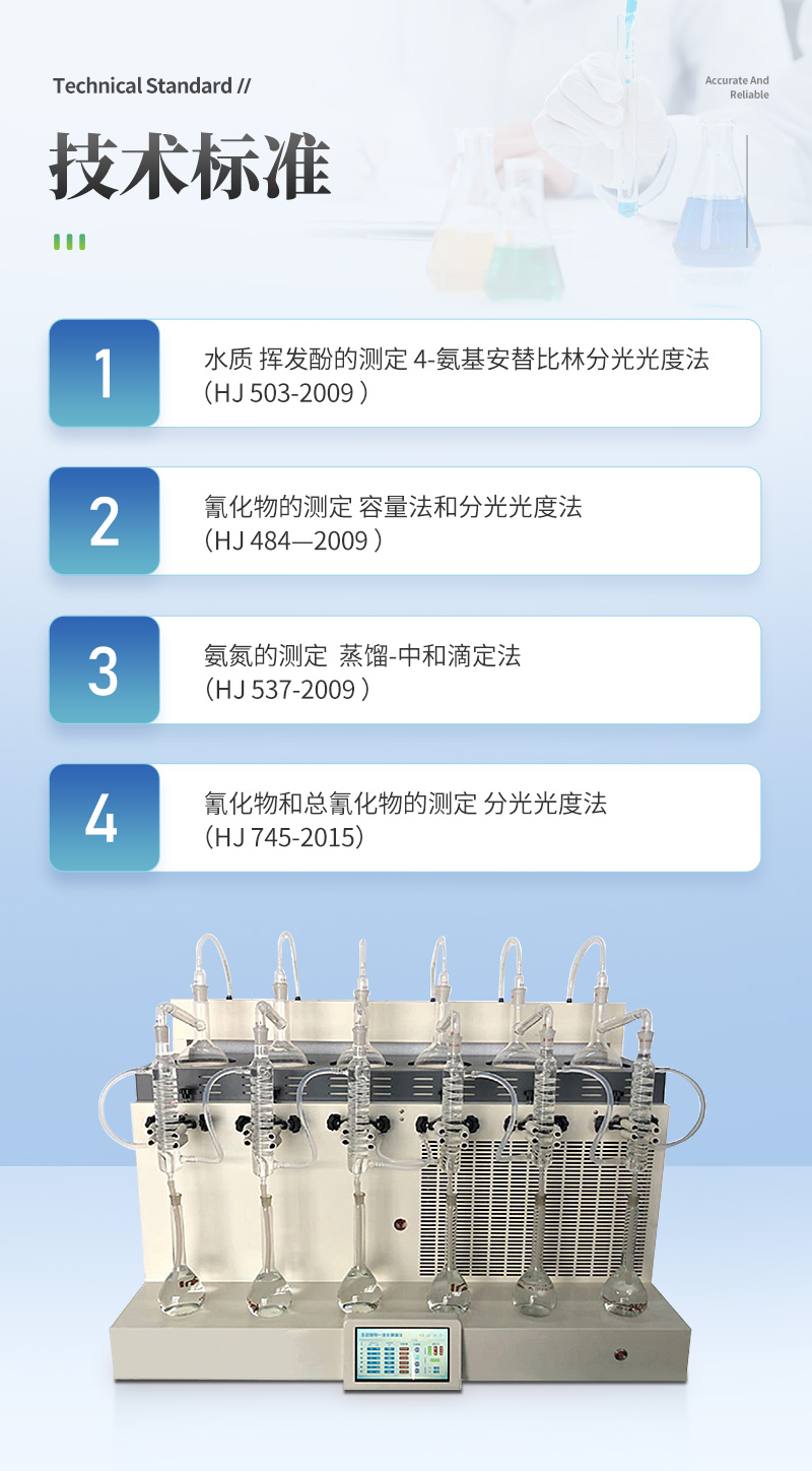 該儀器實(shí)驗(yàn)了控溫、自動(dòng)防倒吸、加熱均勻、防止暴沸、智能終點(diǎn)控制等功能。使用方便,節(jié)能環(huán)保。經(jīng)過實(shí)驗(yàn)室蒸餾回收率比對(duì)驗(yàn)證,結(jié)果準(zhǔn)確,回收率達(dá)95%以上。該儀器可廣泛適用于環(huán)保、疾控、水產(chǎn)、供排水、高校、科研院所、廠礦企業(yè)等各類化學(xué)實(shí)驗(yàn)室需要蒸餾處理的場(chǎng)所,如揮發(fā)酚、氨氮、凱氏氮油中水分等項(xiàng)目的蒸餾處理。