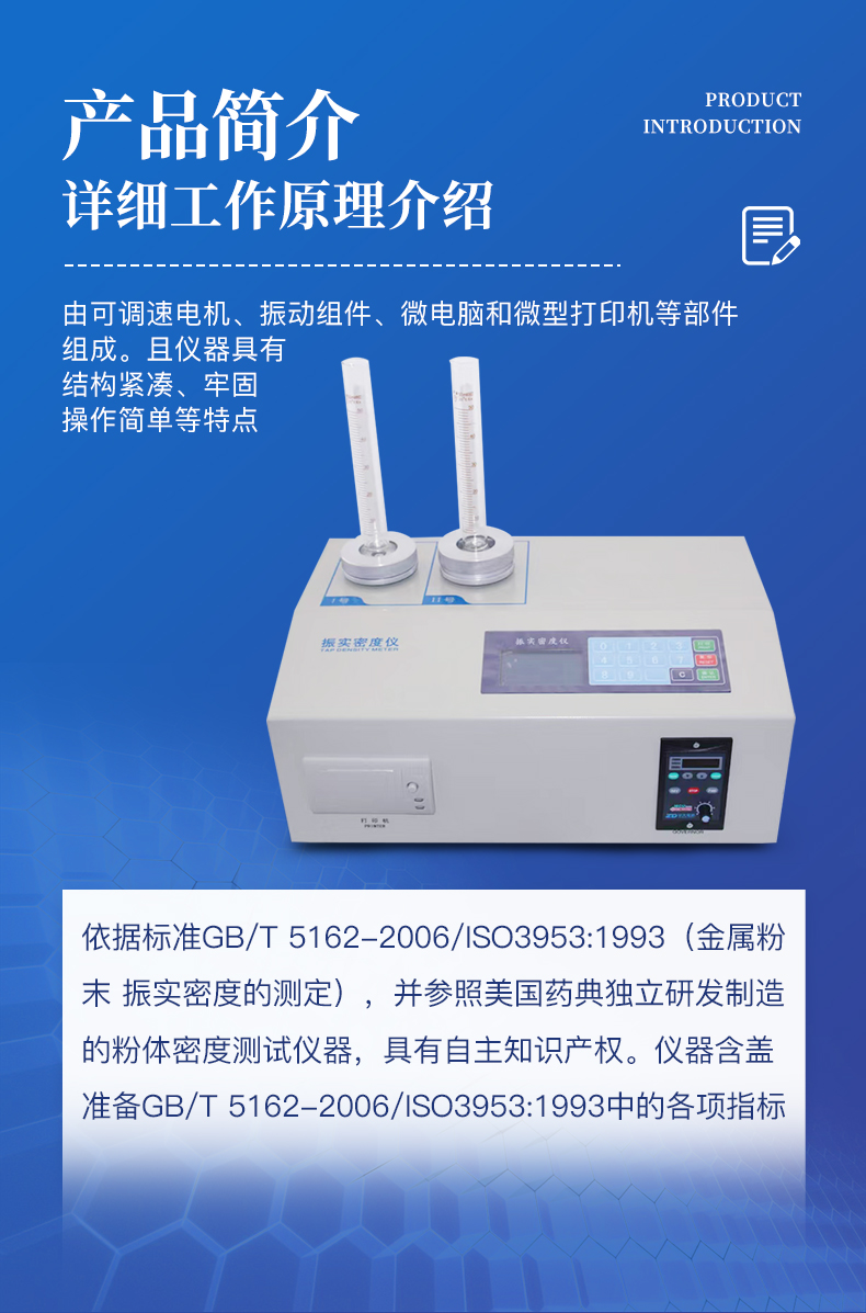 | YT-ZS2型粉體密度測試儀是由丹東市恒瑞儀器有限公司依據(jù)標(biāo)準(zhǔn)GB/T 5162-2006/ISO3953:1993(金屬粉末 振實(shí)密度的測定),并參照美國藥典獨(dú)立研發(fā)制造的粉體密度測試儀器,具有自主知識(shí)產(chǎn)權(quán)。儀器含蓋準(zhǔn)備GB/T 5162-2006/ISO3953:1993中的各項(xiàng)指標(biāo)。 | YT-ZS2型粉體密度測試儀由可調(diào)速電機(jī)、振動(dòng)組件、微電腦和微型打印機(jī)等部件組成。且儀器具有結(jié)構(gòu)緊湊、牢固,操作簡單等特點(diǎn)。 |