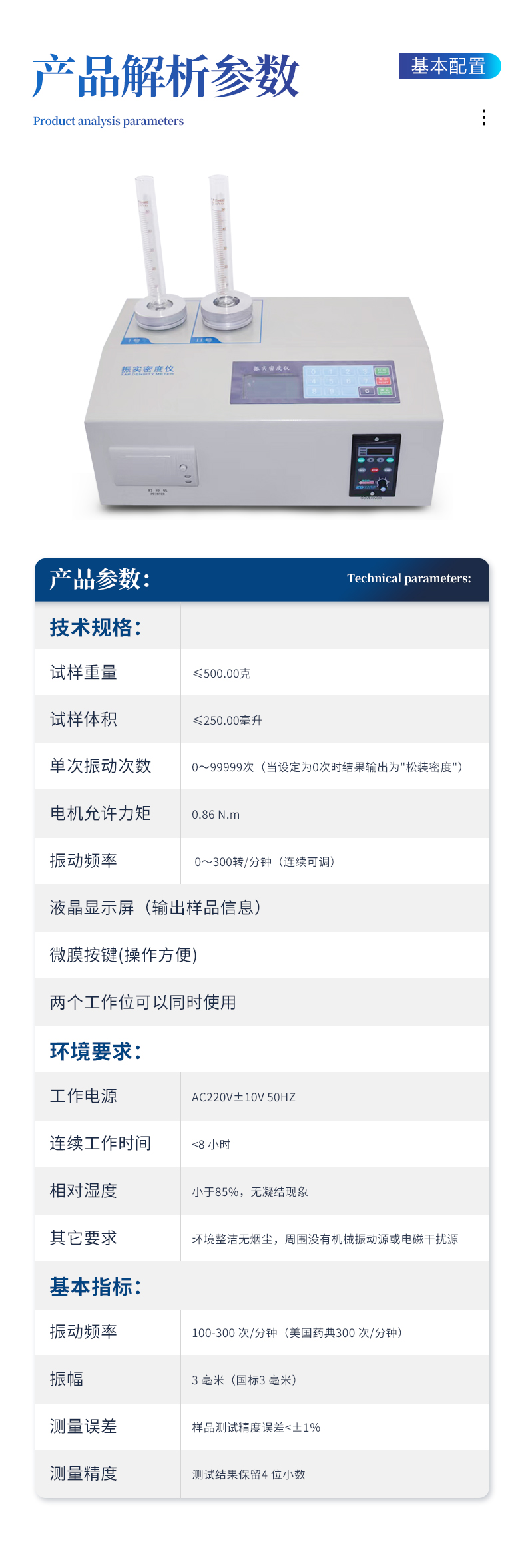 | 試樣重量:≤500.00克; | 試樣體積:≤250.00毫升; | 單次振動(dòng)次數(shù):0~99999次(當(dāng)設(shè)定為0次時(shí)結(jié)果輸出為"松裝密度"); | 電機(jī)允許力矩:0.86 N.m; | 振動(dòng)頻率: 0~300轉(zhuǎn)/分鐘(連續(xù)可調(diào)); | 液晶顯示屏(輸出樣品信息); | 微膜按鍵(操作方便) | 兩個(gè)工作位可以同時(shí)使用 | 振動(dòng)幅度:3mm,(可調(diào)) | ZS2高精度振實(shí)密度儀是專門針對(duì)固體粉體密度的測量儀器,按照國家標(biāo)準(zhǔn)GB/T 5162-2006/ISO3953:1993,參照美國藥典標(biāo)準(zhǔn)研發(fā)制造。廣泛應(yīng)用于工業(yè)、電池材料、藥品材料、奶制品、磨料、造紙、水泥、涂料、科研機(jī)構(gòu)、大中專院校以及各種金屬和非金屬行業(yè)。 |